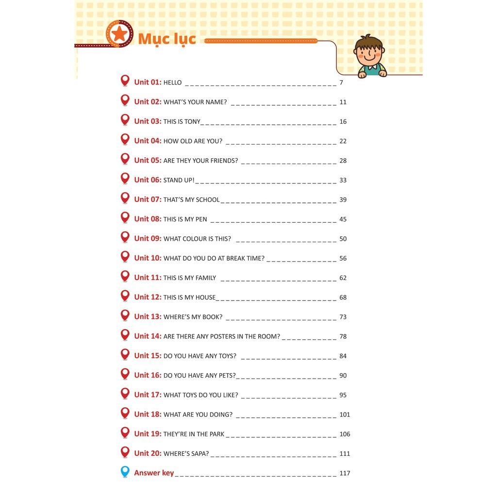 - Cấu trúc bài học chặt chẽ – Ôn tập toàn diện, ghi nhớ nhanh A. Kiến thức cần nhớ – What you need to remember Phần lý thuyết ngắn gọn, giúp các em ôn tập toàn bộ kiến thức từ vựng, cấu trúc và ngữ âm theo mỗi unit trên lớp B. Bài kiểm tra tổng hợp – Let’s put your memory to the test Bài kiểm tra tổng hợp các dạng bài tập thực hành: Trắc nghiệm chọn câu đúng, nghe và điền từ, tìm lỗi sai, nối, hoàn thành câu… C. Đáp án – Answer key Đáp án và lời giải chi tiết cuối sách giúp các em tự đánh giá lại mức độ thông hiểu và ghi nhớ, khắc sâu thêm kiến thức