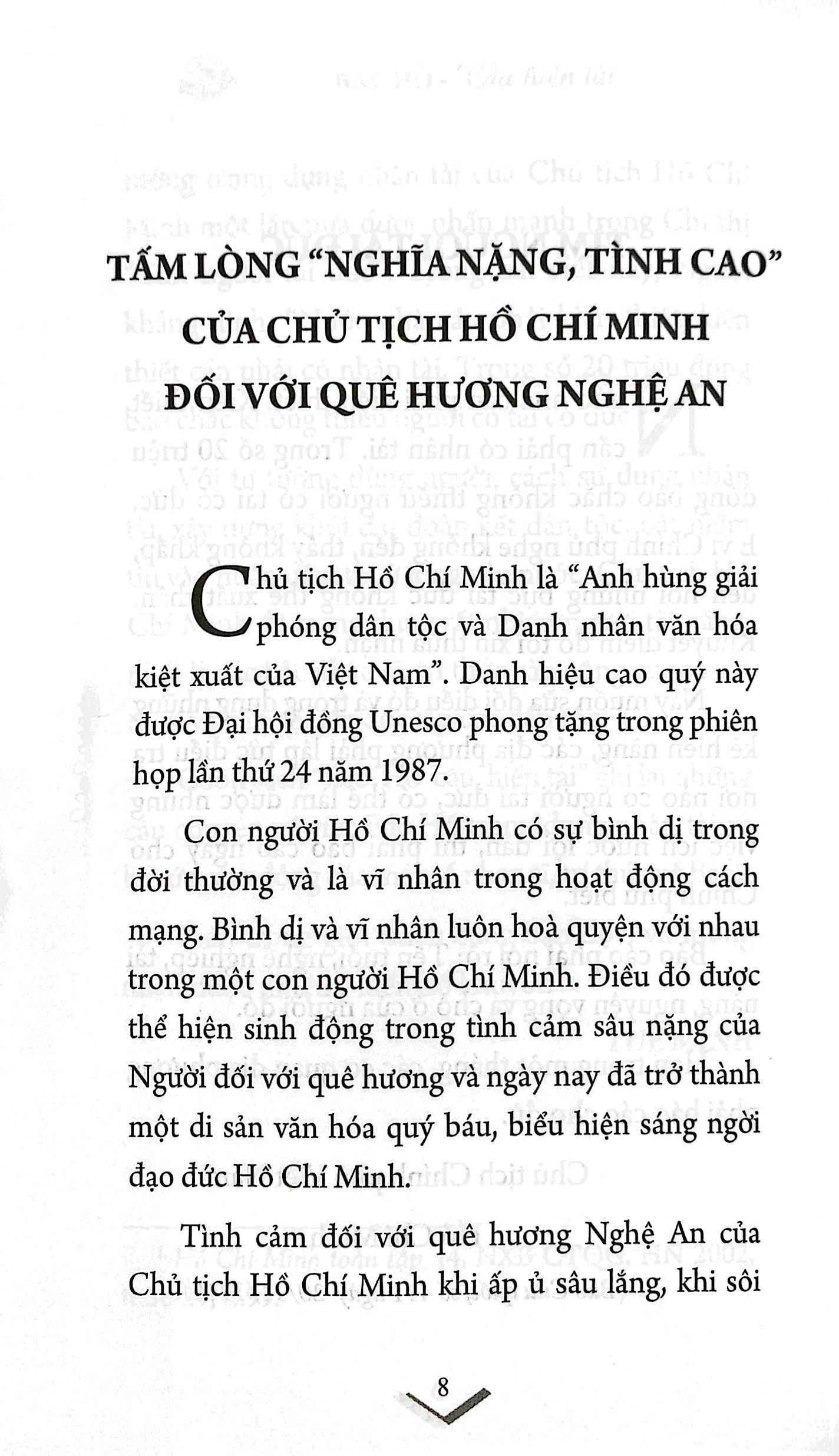 Cả cuộc đời vì nước, vì dân, Bác Hồ là biểu tượng cao đẹp nhất của chủ nghĩa yêu nước và chủ nghĩa anh hùng cách mạng Việt Nam. Tấm gương đạo đức trong sáng, phong cách sống và làm việc của Người là mẫu mực, có sức cảm hóa và thúc đẩy cho mọi thế hệ cán bộ, đảng viên và nhân dân học tập, noi theo.