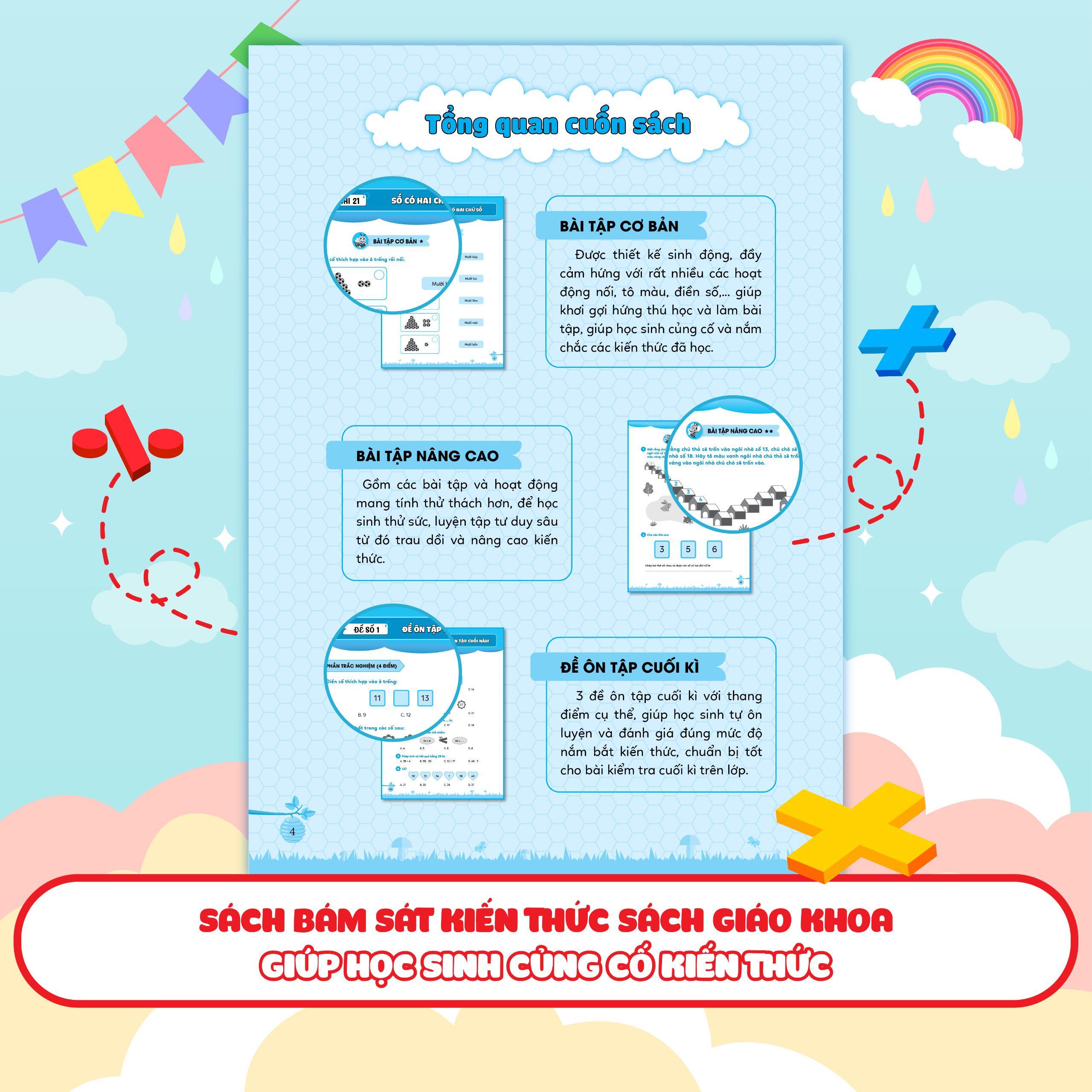 Các bài tập trong phần này được thiết kế sinh động, đầy cảm hứng với rất nhiều các hoạt động nối, tô màu, điền số,... giúp khơi gợi hứng thú học và làm bài tập của các em, đồng thời giúp các em củng cố và nắm chắc các kiến thức đã học.