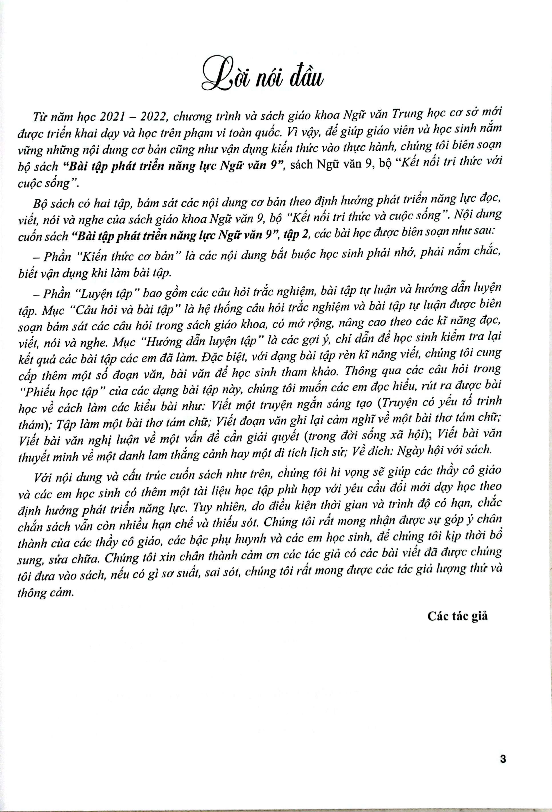 Năm học 2021-2022, chương trình và sách giáo khoa Ngữ văn Trung học cơ sở mới (bắt đầu từ lớp 9 được triển khai dạy và học trên phạm vi toàn quốc. Vì vậy, để giúp giáo viên và học sinh nắm vững những nội dung cơ bản cũng như vận dụng kiến thức vào thực hành, chúng tôi biên soạn cuốn “Bài tập phát triển năng lực Ngữ văn 9".