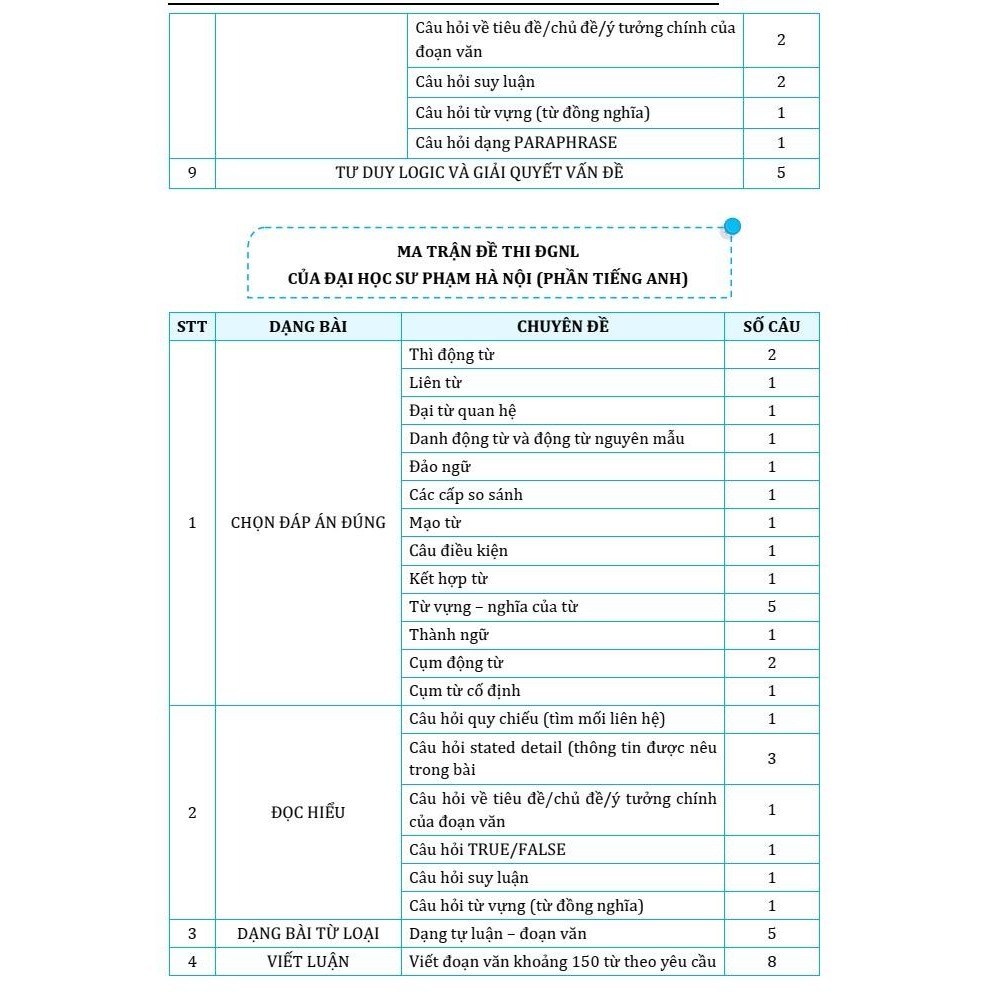Phần 4: Phần đề thi gồm 60 đề phát triển theo form đề thi ĐGNL của Đại học Quốc gia Hà Nội (ĐHQG HN), Đại học Quốc gia TP.HCM (ĐHQG HCM), và Đại học Sư phạm Hà Nội (ĐHSP HN)