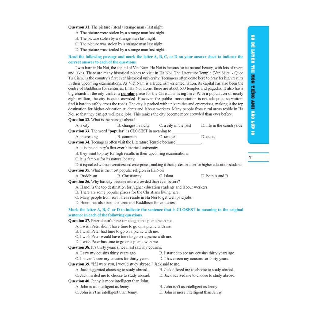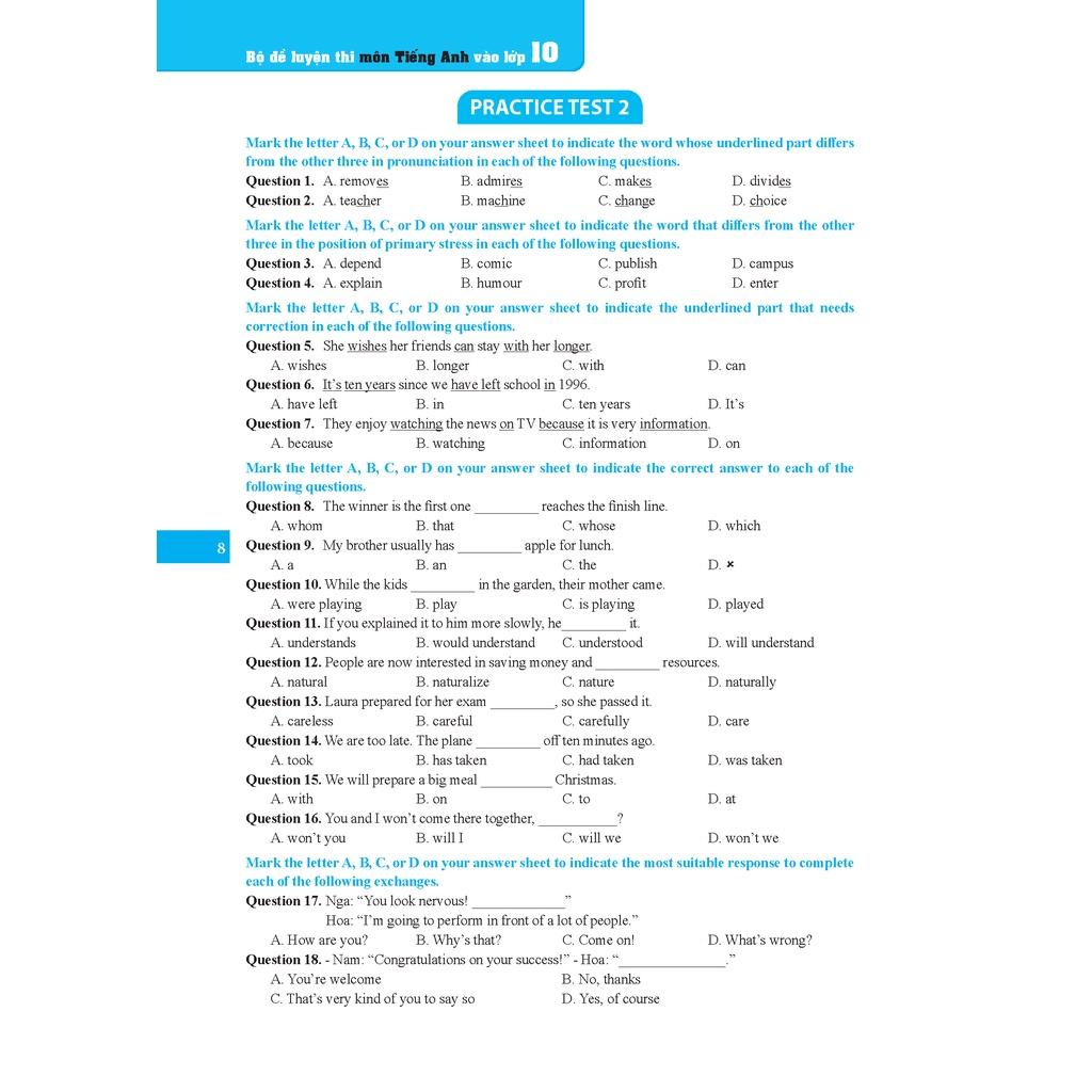 Cuốn sách “Bộ đề luyện thi môn Tiếng Anh vào lớp 10” được các tác giả biên soạn sẽ giúp các em học sinh lớp 9, những người chuẩn bị vượt vũ môn để vào được ngôi trường Trung học phổ thông mơ ước, có cái nhìn tổng thể về cấu trúc đề thi, làm quen với các dạng bài thi, ôn luyện kiến thức và bứt phá điểm thi trong giai đoạn nước rút. Ngoài ra, cuốn sách còn có thể làm nguồn tài liệu ôn tập, tham khảo tin cậy dành cho giáo viên, quý phụ huynh và các em học sinh các khối lớp khác.