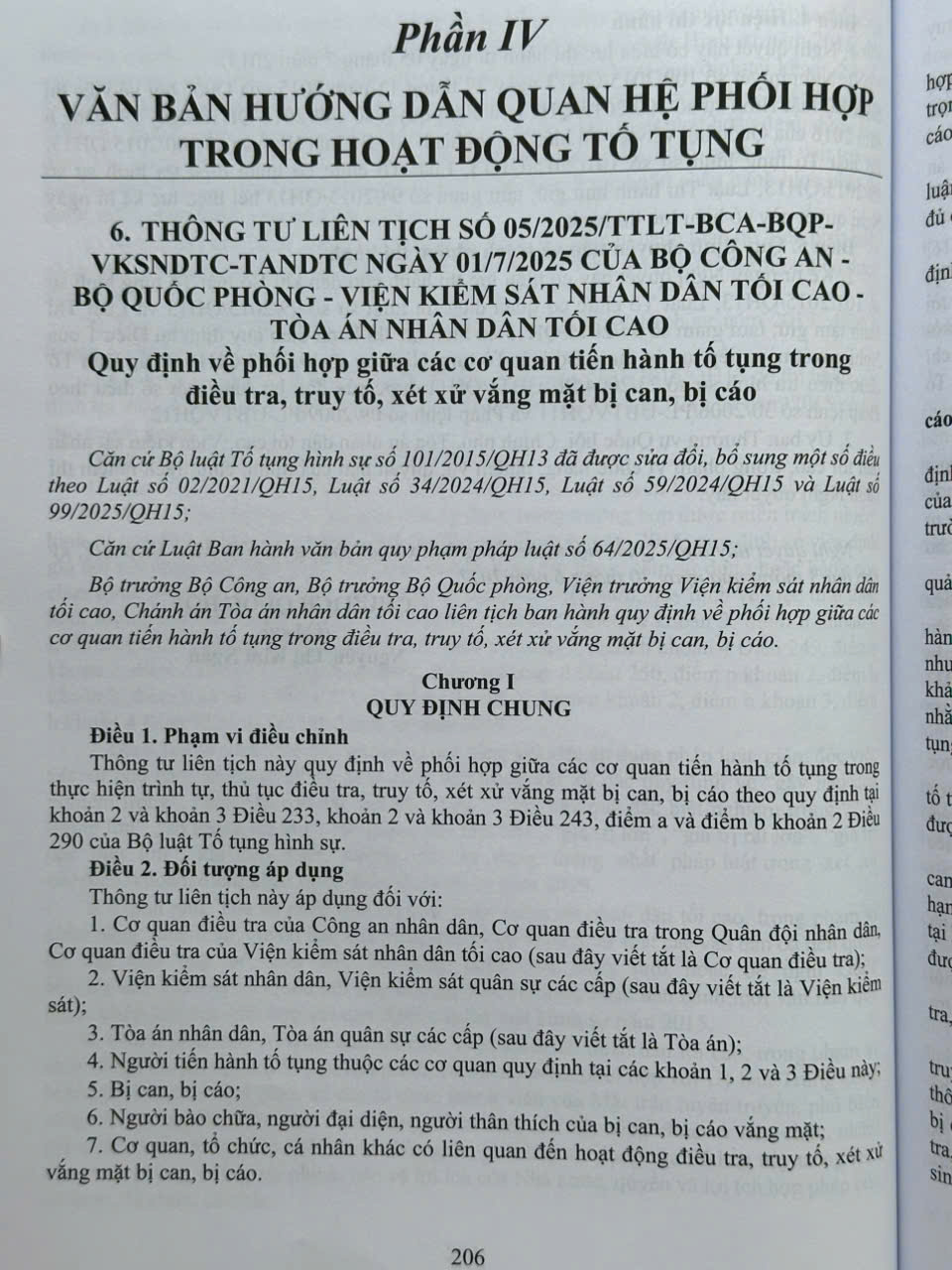 – Thông tư liên tịch 05/2025/TTLT-BCA-BQP-VKSNDTC-TANDTC ngày 01/7/2025 Quy định về phối hợp giữa các cơ quan tiến hành tố tụng trong điều tra, truy tố, xét xử vắng mặt bị can, bị cáo;