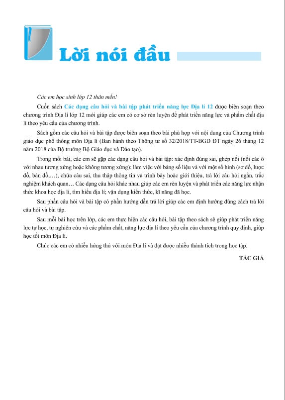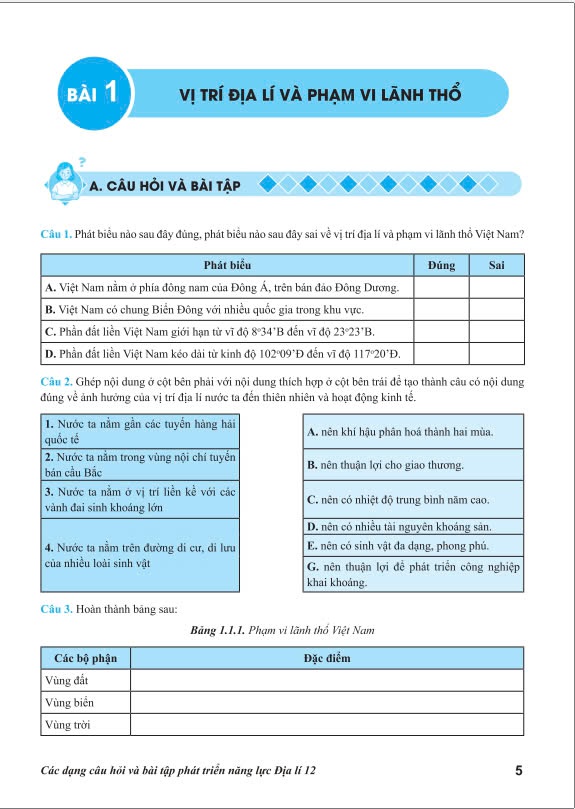 Trong mỗi bài, các em sẽ gặp các dạng câu hỏi và bài tập: xác định đúng sai, ghép nối (nối các ô với nhau tương xứng hoặc không tương xứng); làm việc với bảng số liệu và với một số hình (sơ đồ, lược đổ, bản đồ,), chữa câu sai, thu thập thông tin và trình bày hoặc giới thiệu, trả lời câu hỏi ngắn, trắc nghiệm khách Các dạng câu hỏi khác nhau giúp các em rèn luyện và phát triển các năng lực nhận thức khoa học địa lí, tìm hiểu địa li; vận dụng kiến thức, kĩ năng đã học.