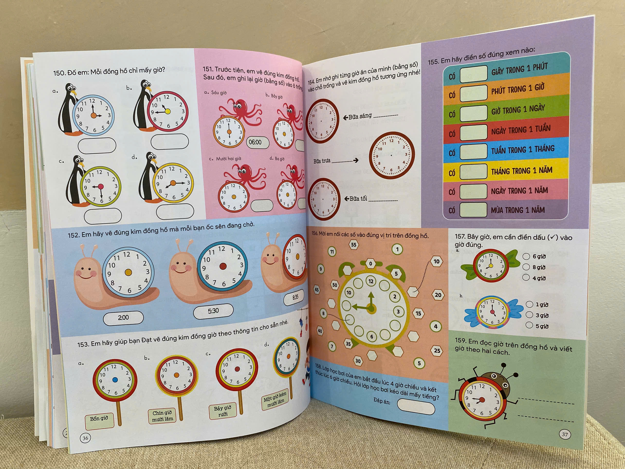 Với hơn 200 bài tập tương tác, cuốn sách giúp trẻ: Làm quen với số đếm, phép cộng – trừ, phân loại và so sánh số: Hiểu quy luật tăng/giảm, đo lường đơn giản, nhận biết hình học; Rèn luyện tư duy logic, quan sát và ghi nhớ; Luyện viết số đúng nét và phát triển khả năng suy luận qua tình huống. Mỗi trang là một bài tập thú vị, giúp bé hiểu bản chất của toán học thay vì học thuộc khô khan. Bé sẽ đếm bong bóng, giải phép cộng bằng hình ảnh, phân loại bánh kem và làm quen với giờ đồng hồ....