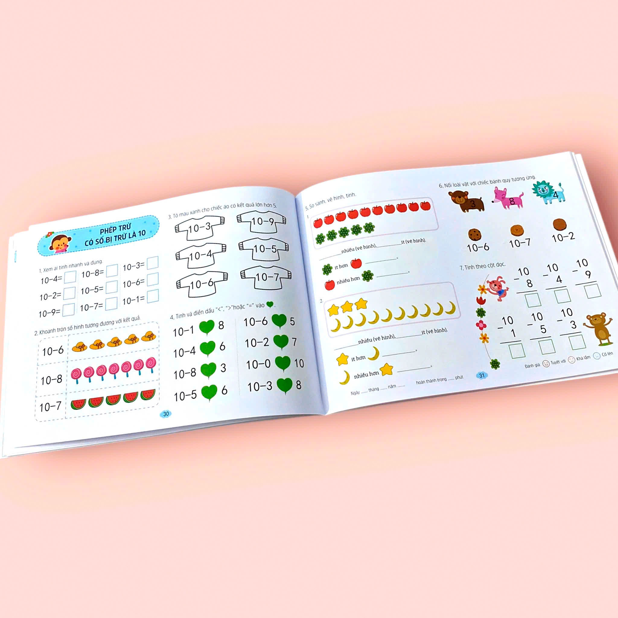 Mỗi cuốn sách gồm 55 trang, mỗi trang lại được lấp đầy bởi những phép toán, kèm theo hình minh họa thú vị sẽ làm trẻ thích thú hơn với việc làm quen với những phép tính cộng, trừ trong phạm vi 10.