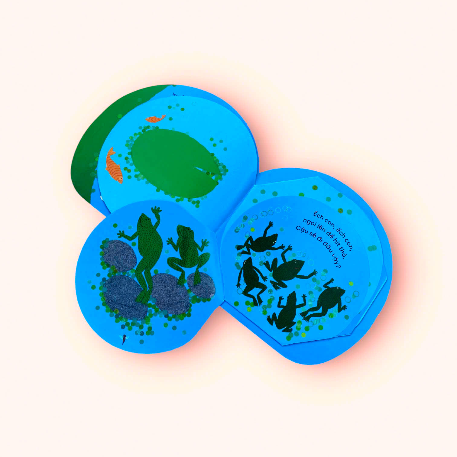 "ẾCH XANH BÉ NHỎ" là cuốn sách tranh đáng yêu của tác giả Frances Barry mở ra một cách sáng tạo toàn bộ vòng đời kỳ diệu của ếch. Từ một quả trứng đến con nòng nọc rồi thành một chú ếch trưởng thành. Hãy cùng lật giở các trang sách, ngắm nhìn từng giai đoạn trong vòng đời của ếch xem chúng phát triển như thế nào nhé! Trứng ếch nổi trong ao, nhưng chúng sẽ lớn lên như thế nào nhỉ? Từng trang sách được minh họa sinh động, các bạn nhỏ sẽ nhận thấy sự thay đổi đến ngạc nhiên: từ trứng nở thành nòng nọc, sự xuất hiện của chân sau và chân trước, chiếc đuôi dần teo lại và những con ếch đã sẵn sàng nhảy lên để hít thở không khí. Cuốn sách mở ra hình một bông hoa với bức tranh cực kỳ sống động: một cái ao đầy hoa súng với những chú ếch đang nhảy nhót khắp nơi. Đây là cuốn sách thú vị để giới thiệu với trẻ về vòng đời của ếch. Các trang sách được lồng vào nhau làm cho cuốn sách trở nên đặc biệt. Các trang sách gấp vào, mở ra được thiết kế như một cánh hoa cực kỳ sáng tạo. Lật giở đến trang cuối cùng các bé sẽ học được “cách nuôi nòng nọc tại nhà”, những việc cần làm và cách chăm sóc nòng nọc. Và kết thúc bằng việc thả ếch trở lại ao – nơi có không gian rộng để chúng trưởng thành rồi lại sinh sôi, nảy nở.