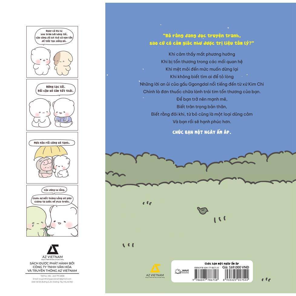 Chúc bạn một ngày ấm áp với nhân vật minh họa là chú gấu chữa lành Ggongdal, được biết đến như một cuốn sách tranh dễ thương và sinh động. Nếu bạn đọc sách vào ngày trời đẹp, bầu trời trong mắt bạn sẽ thêm phần trong phần trong xanh. Nếu bạn đọc sách vào ngày buồn, bầu trời cũng không còn nhuốm màu xám ngắt nữa. Qua 304 trang sách, Chúc bạn một ngày ấm áp chỉ muốn nhắn gửi một điều: