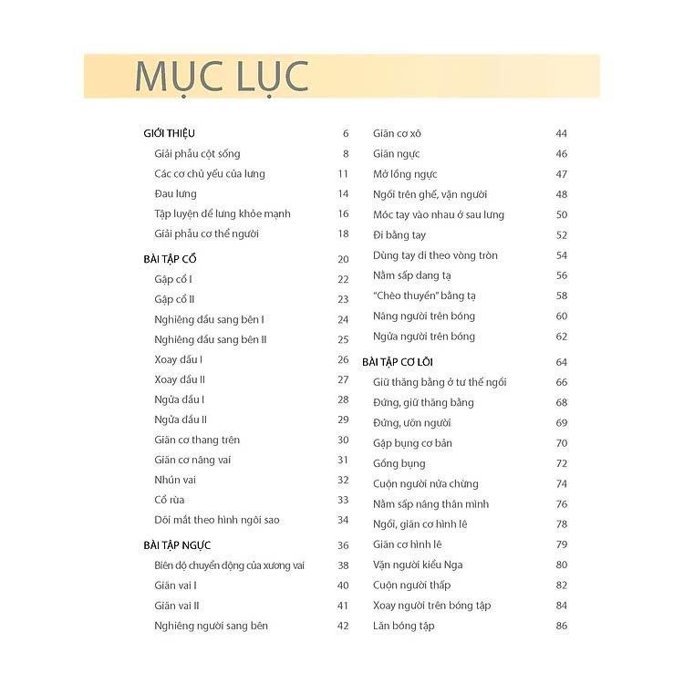 Sách đưa ra các các biện pháp phòng ngừa đau lưng và cổ mãn tính bằng cách hướng dẫn cách tập các bài tập cổ, bài tập ngực, bài tập cơ lõi, bài tập thắt lưng, bài tập cho thân dưới cùng sự phối hợp các bài tập từ tất cả các bộ phận khác nhau có tác dụng tốt đối với cổ, lưng trên, thắt lưng cột sống…
