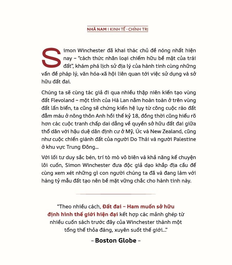 Chúng ta sẽ cùng tác giả đi qua nhiều thập niên kiến tạo vùng đất Flevoland – một tỉnh của Hà Lan nằm hoàn toàn ở trên vùng đất lấn biển, ta cũng sẽ chứng kiến hệ lụy từ công cuộc rào đất đẫm máu ở nông thôn Anh hồi thế kỷ 18, đồng thời cũng hiểu rõ hơn các cuộc tranh chấp dai dẳng về quyền sở hữu đất đai giữa thổ dân với hậu duệ dân định cư ở Mỹ, Úc và New Zealand, cũng như cuộc chiến giành đất của người Do Thái và người Palestine ở khu vực Trung Đông...