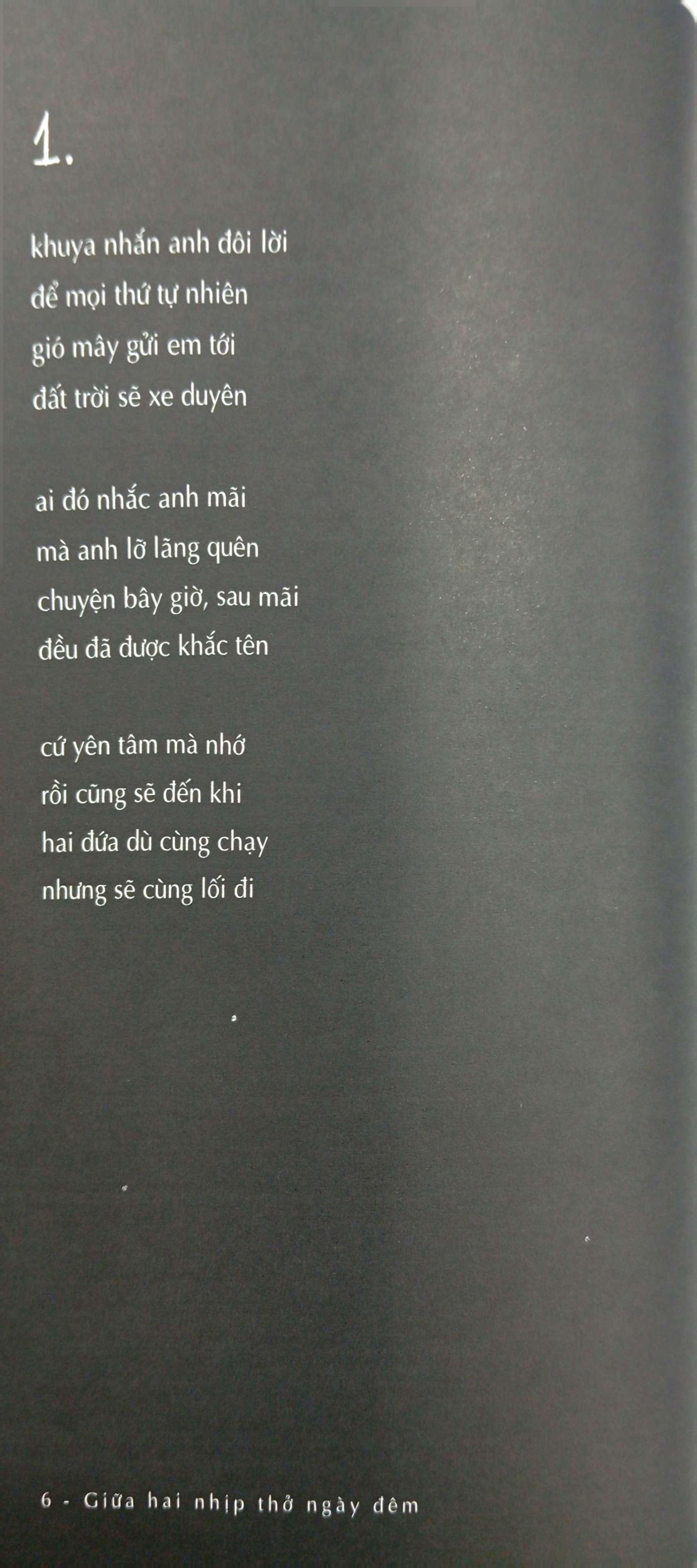 Những câu thơ trong “Giữa hai nhịp thở ngày đêm” có thể diễn giải trăn trở sâu thẳm trong nội tâm cậu. Chúng cho phép cậu lắng nghe, vỗ về, đối thoại, thậm chí tranh cãi hay giằng xé với chính m.ình. Nhưng dù là thấu hiểu hay đấu tranh, tất cả đều diễn ra từ chính tâm hồn cậu - nơi cậu không cần phải trốn chạy hay trông chờ vào sự cứu rỗi từ bất kỳ ai khác.