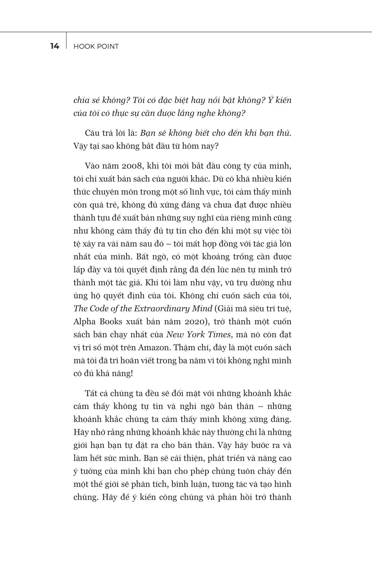 May mắn thay, Brendan Kane, một nhà tư tưởng và chiến lược sáng tạo, người đã xây dựng nền tảng cho những người nổi tiếng như Taylor Swift và Rhianna, đồng thời làm việc với các công ty Fortune 500 như Paramount, Viacom và MTV, đã thành thạo nghệ thuật trở nên nổi bật. "Hook Point - Điểm níu chân khách hàng trong thế giới 3 giây hối hả" là một cuốn sách sâu sắc cung cấp các chiến lược và kỹ thuật có giá trị để thu hút và duy trì sự chú ý trong thế giới có nhịp độ nhanh và khan hiếm sự chú ý ngày nay. Cuốn sách đưa ra lời khuyên thiết thực về việc tạo ra những điểm hấp dẫn và hiệu quả để thu hút khán giả chỉ trong vài giây.