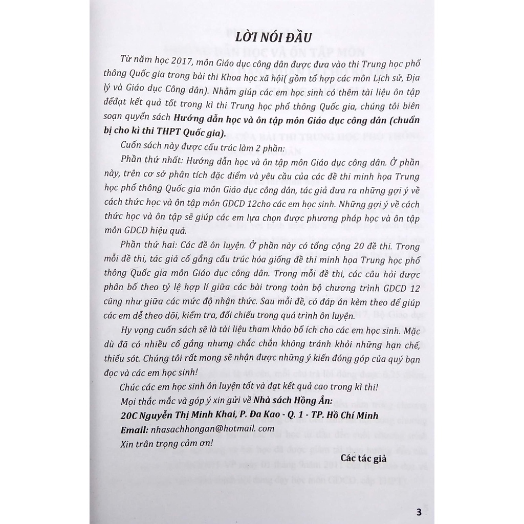 Từ năm 2017, môn Giáo dục công dân được đưa vào thi Trung học phổ thông Quốc gia trong bài thi Khoa học xã hội (gồm tổ hợp các môn Lịch sử, Địa lý và Giáo dục Công dân). Nhằm giúp các em học sinh có thêm tài liệu ôn tập để đạt kết quả tốt trong kì thi Trung học phổ thông Quốc gia, các tác giả biên soạn cuốn sách Hướng Dẫn Học Và Ôn Tập Môn Giáo Dục Công Dân (chuẩn bị cho kì thi THPT Quốc gia).
