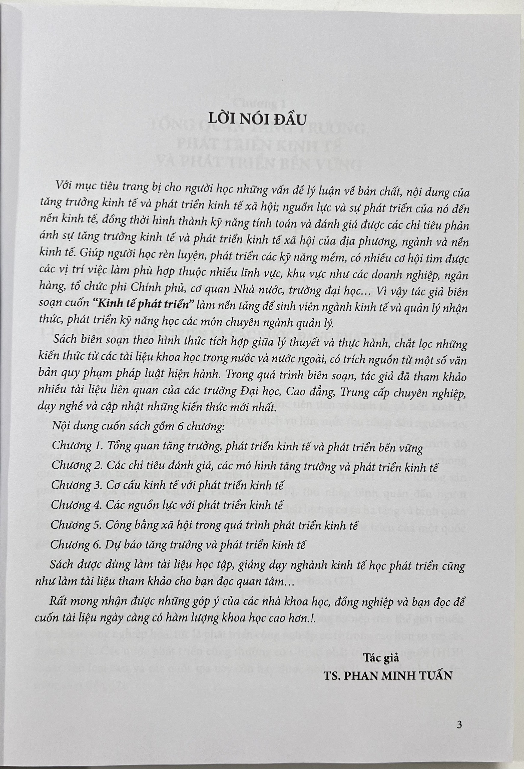 Với mục tiêu trang bị cho người học những vấn đề lý luận về bản chất, nội dung của tăng trưởng kinh tế và phát triển kinh tế xã hội; nguồn lực và sự phát triển của nó đến nền kinh tế, đồng thời hình thành kỹ năng tính toán và đánh giá được các chỉ tiêu phản ánh sự tăng trưởng kinh tế và phát triển kinh tế xã hội của địa phương, ngành và nền kinh tế. Giúp người học rèn luyện, phát triển các kỹ năng mềm, có nhiều cơ hội tìm được các vị trí việc làm phù hợp thuộc nhiều lĩnh vực, khu vực như các doanh nghiệp, ngân hàng, tổ chức phi Chính phủ, cơ quan Nhà nước, trường đại học... Vì vậy tác giả biên soạn cuốn “Kinh tế phát triển” làm nền tảng để sinh viên ngành kinh tế và quản lý nhận thức, phát triển kỹ năng học các môn chuyên ngành quản lý.