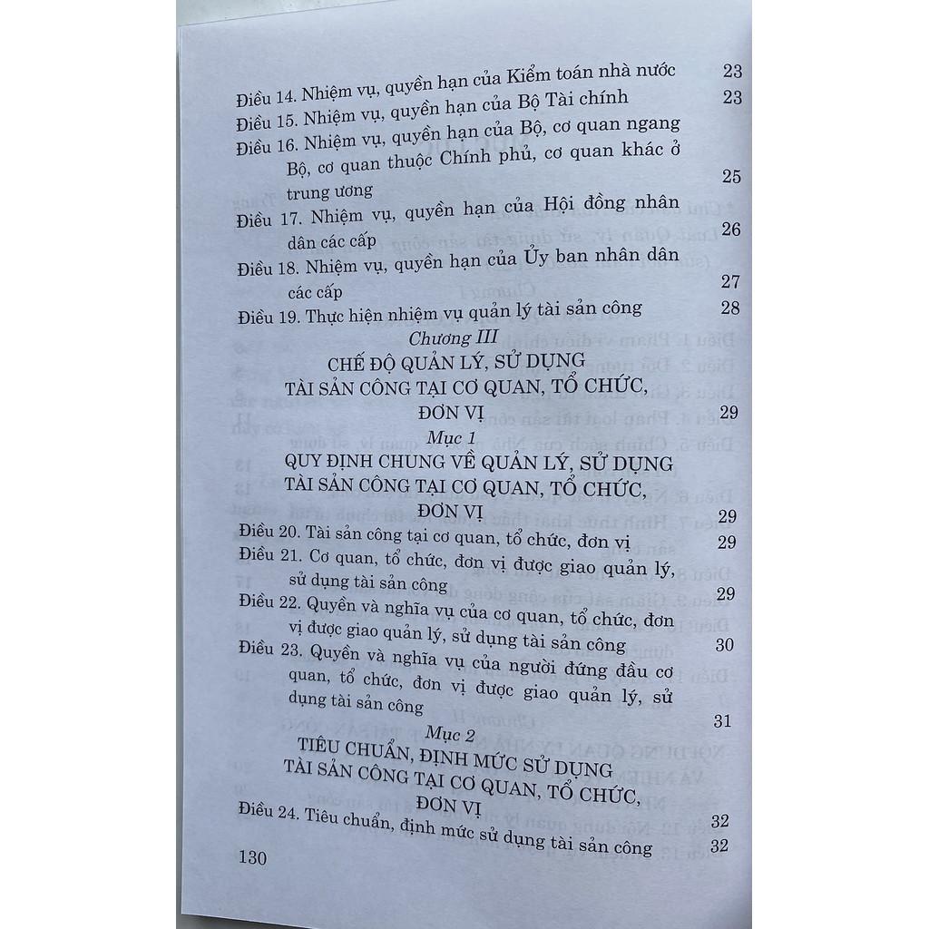 Quốc hội nước Cộng hòa xã hội chủ nghĩa Việt Nam khóa XIV, kỳ họp thứ 3 thông qua ngày 21/6/2017, có hiệu lực thi hành từ ngày 01/01/2018 quy định về quản lý nhà nước đối với tài sản công; chế độ quản lý, sử dụng tài sản công; quyền và nghĩa vụ của các cơ quan, tổ chức, đơn vị, cá nhân trong việc quản lý, sử dụng tài sản công.