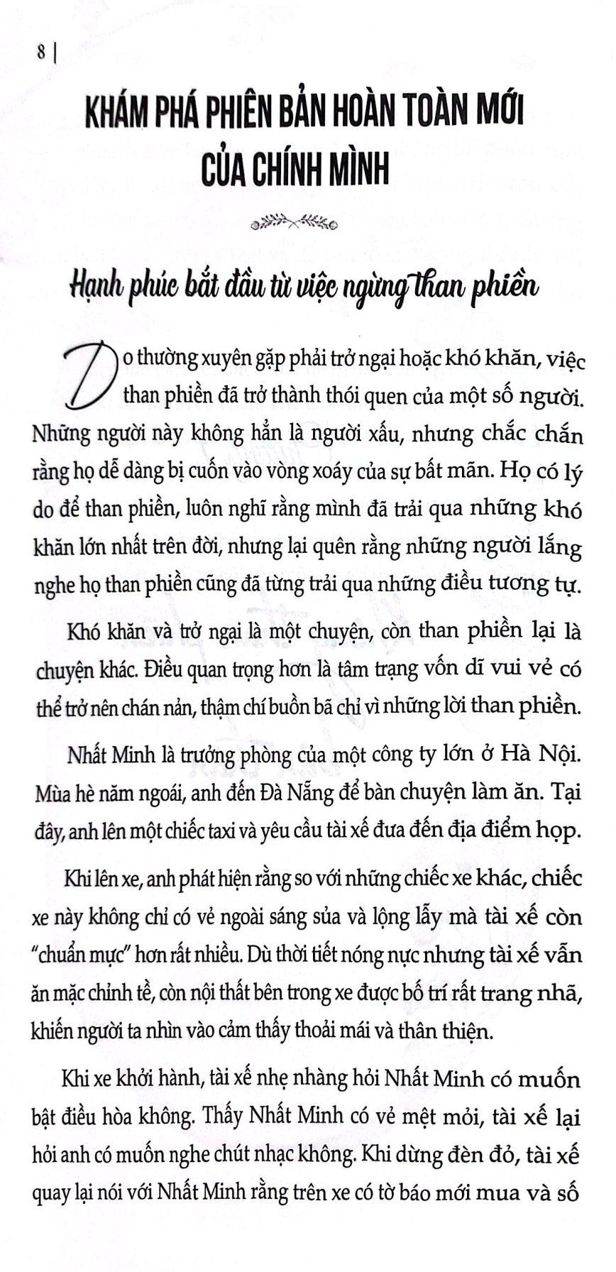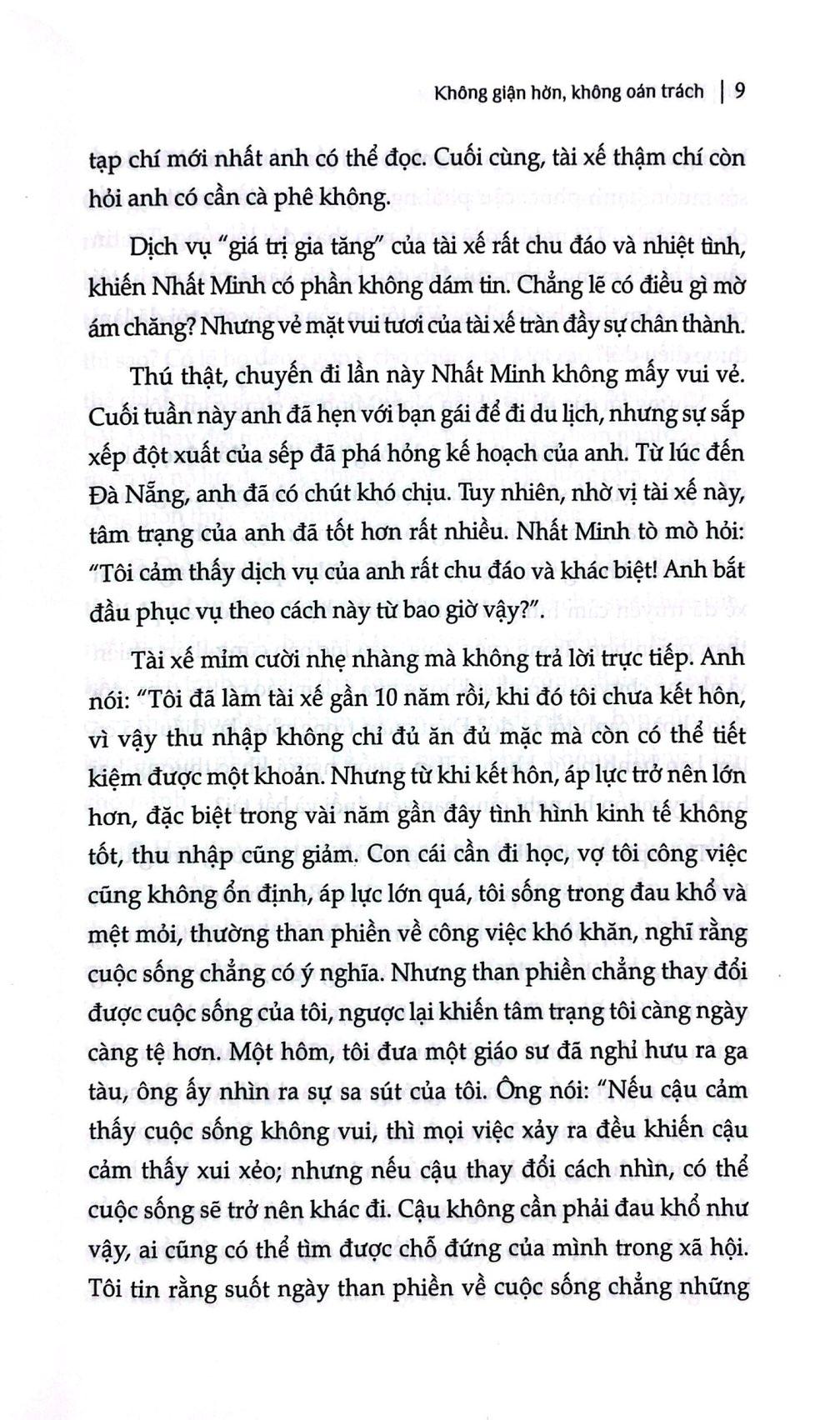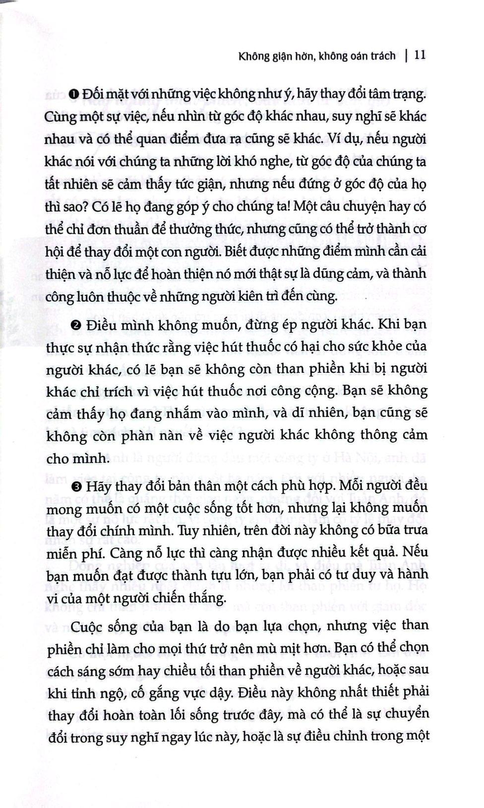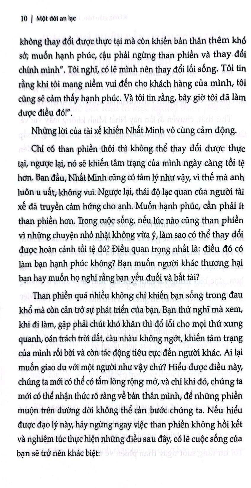Một Đời An Lạc - Không Giận Hờn, Không Oán Trách Nếu bạn chỉ tập trung vào những bất hạnh của chính m.ình, oán trách về mọi thứ, phàn nàn về sự bất công của thế giới thì bạn chỉ có thể sống trong một thế giới nhỏ bé và sẽ không bao giờ thành công, hạnh phúc. Ngược lại, nếu bạn có thể biến những lời phàn nàn thành động lực để tiến về phía trước, dành thời gian để trau dồi bản thân, làm việc chăm chỉ để thay đổi điều kiện sống, chứng minh bản thân bằng sự thật và để bản thân trưởng thành thì cuối cùng bạn sẽ có thể tạo ra sự công bằng mà bạn mong muốn một cách lý tưởng. Đừng phàn nàn về xuất thân khiêm tốn của bạn cũng đừng phàn nàn về sự bất hạnh của bạn. Thế giới không nợ bạn bất cứ điều gì. Chỉ cần bạn luôn giữ thái độ lạc quan thì không gì có thể cản trở sự thành công của bạn.