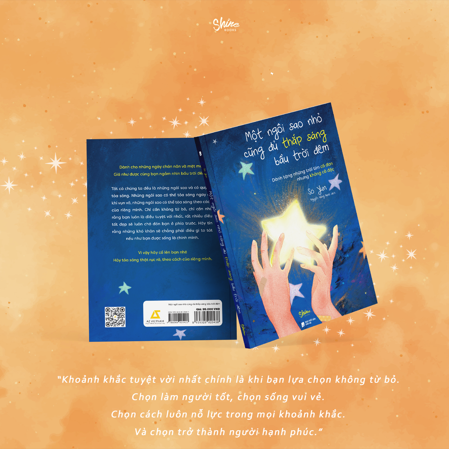 Một Ngôi Sao Nhỏ Cũng Đủ Thắp Sáng Bầu Trời Đêm Dành cho những ngày chán nản và mệt mỏi Giá như được cùng bạn ngắm nhìn bầu trời đêm… Tất cả chúng ta đều là những ngôi sao và có quyền tỏa sáng. Những ngôi sao có thể tỏa sáng ngay cả khi vụn vỡ, những ngôi sao có thể tỏa sáng theo cách của riêng m.ình. Chỉ cần không từ bỏ, chỉ cần nhớ rằng bạn luôn là điều tuyệt vời nhất, rất nhiều điều tốt đẹp sẽ luôn chờ đón bạn ở phía trước. Hãy tin rằng những khó khăn sẽ chẳng phải điều gì to tát nếu như bạn được sống là chính m.ình. Vì vậy hãy cố lên bạn nhé Hãy tỏa sáng thật rực rỡ, theo cách của riêng m.ình. Trích dẫn trong sách: Khoảnh khắc tuyệt vời nhất chính là khi bạn lựa chọn không từ bỏ. Chọn làm người tốt, chọn sống vui vẻ Chọn cách luôn nỗ lực trong mọi khoảnh khắc Và chọn trở thành người hạnh phúc.