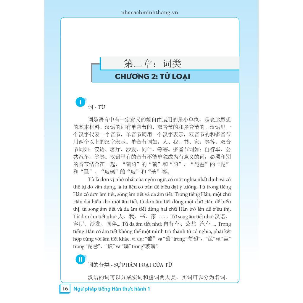 GIỚI THIỆU SÁCH Ngữ pháp tiếng Hán thực hành tập 1 - Trình độ sơ cấp-trung cấp (bìa mềm) Giáo trình “Ngữ pháp tiếng Hán thực hành” chỉ tập trung giới thiệu với người học những kiến thức cơ sở cơ bản nhất. Cuốn “Ngữ pháp tiếng Hán thực hành” được chia thành 2 tập. Tập 1 ngoài chương 1 giới thiệu chung về ngữ pháp tiếng Hán hiện đại, 4 chương còn lại tập trung giới thiệu vào các nội dung: Từ loại - Cụm từ - Thành phần câu - Câu đơn. Tập 2 có 5 chương, *Giới thiệu về các nội dung: