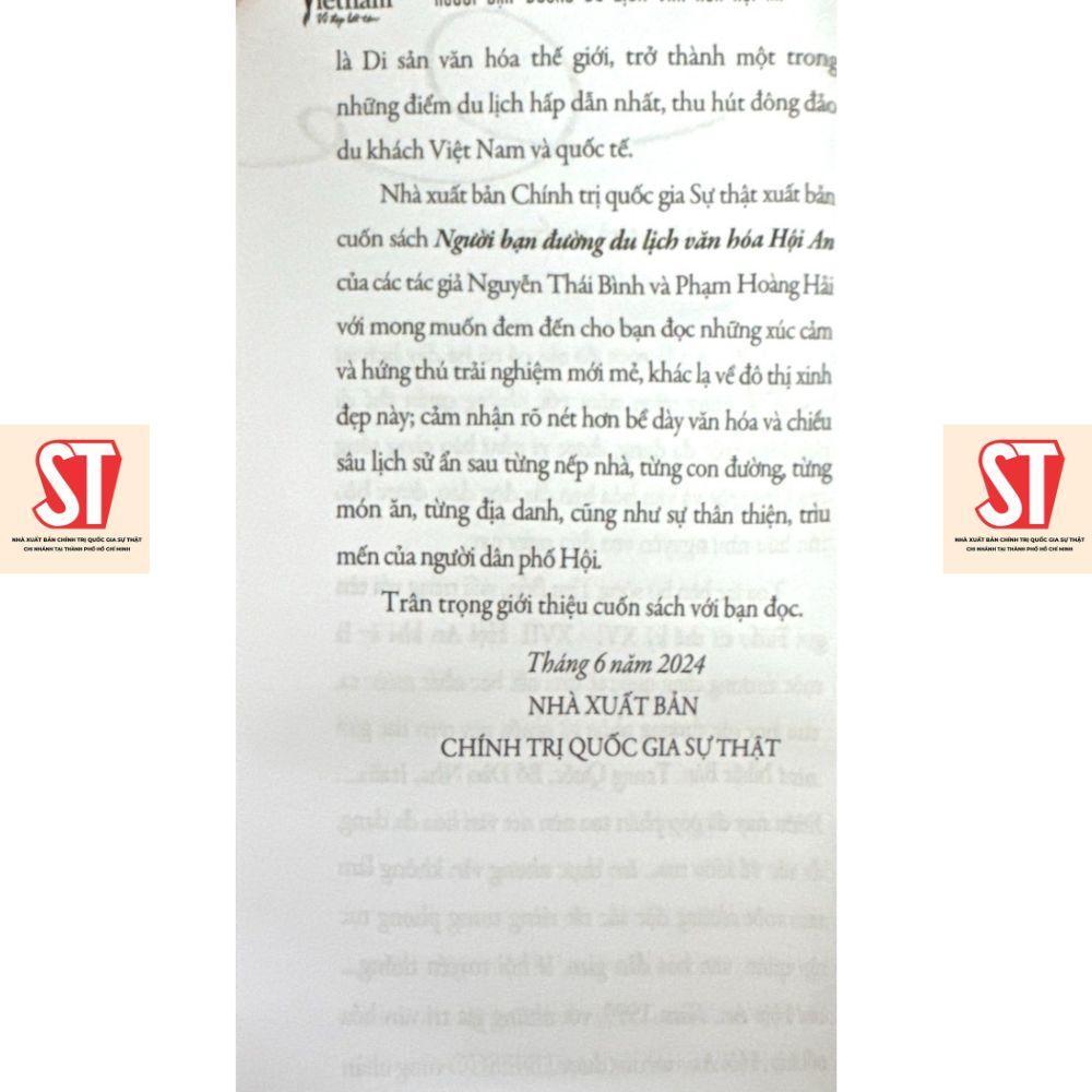 Từ Hội An trở về, cuốn sách chính là những hồi ức để hình ảnh thành phố di sản này vẫn lắng đọng đầy hoài niệm trong bạn. Rất có thể, bạn sẽ thấy nuối tiếc vì đã không lưu lại phố Hội lâu hơn, và biết đâu một ngày nào đó, bạn sẽ trở lại Hội An một lần nữa. Lúc đó, xin đừng quên bạn đã có sẵn trong tay một Người bạn đường du lịch văn hóa Hội An.