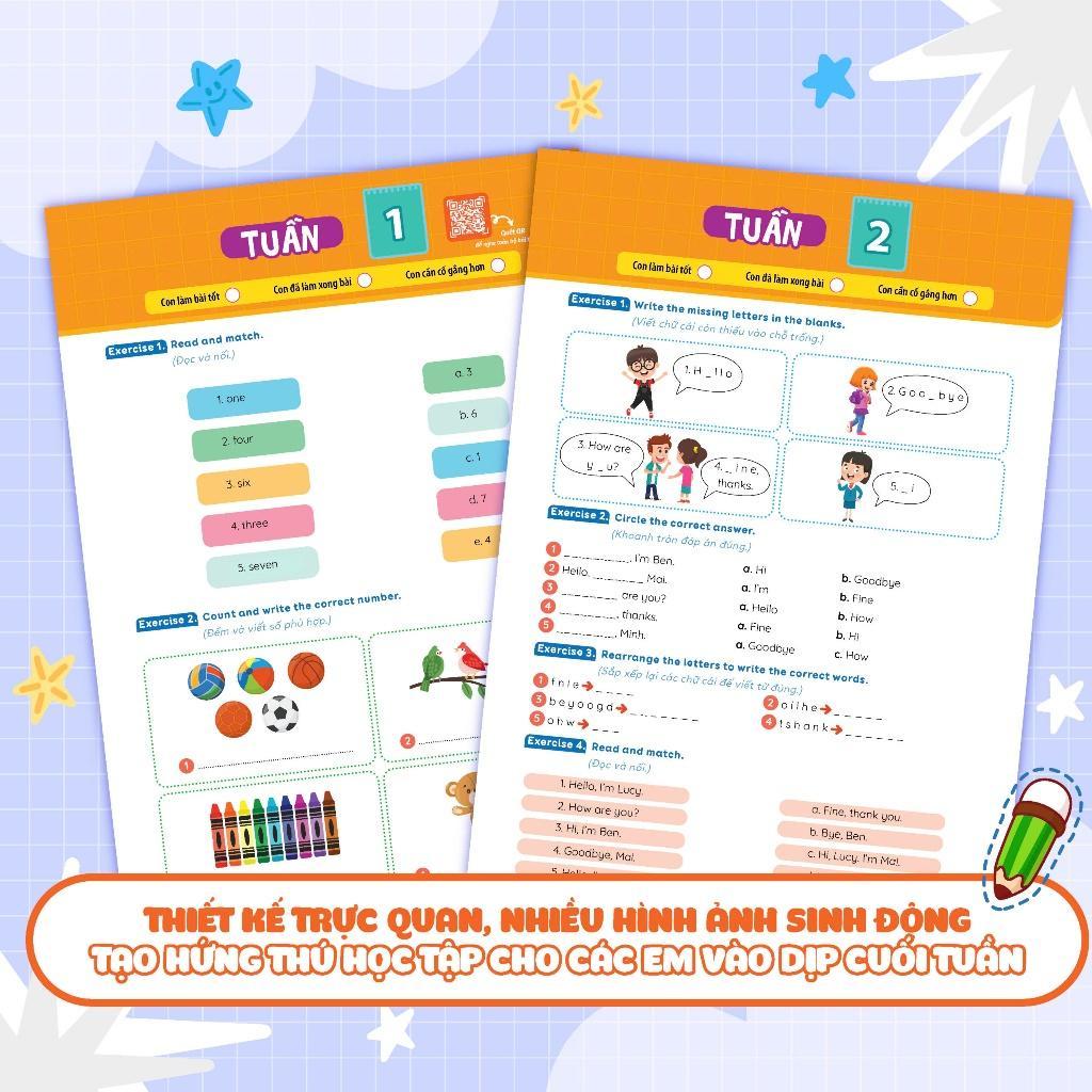 Sách được thiết kế với bố cục dễ hiểu với nhiều hình ảnh và được in màu sinh động giúp các con hứng thú với việc học vào những ngày cuối tuần.