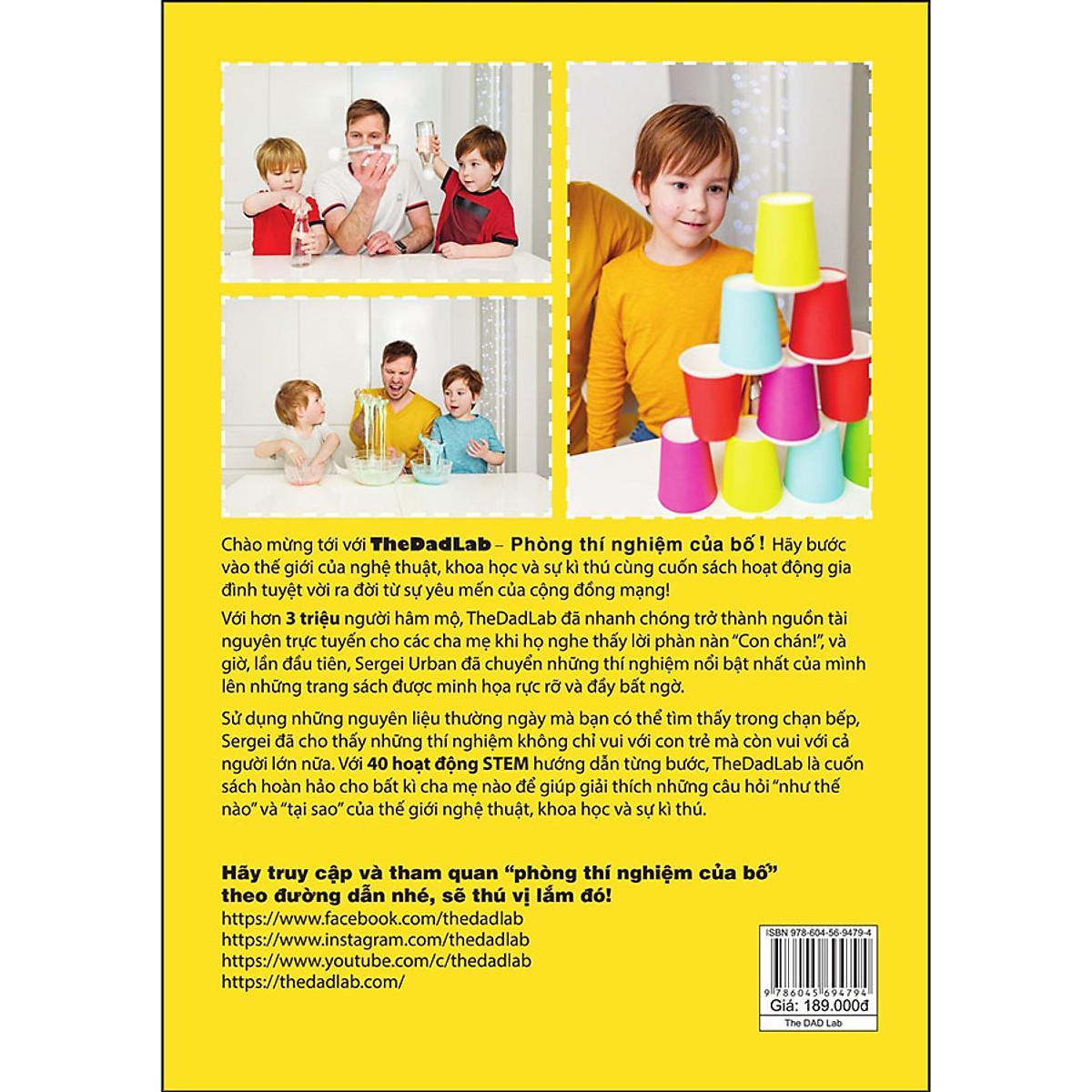 Với hơn 3 triệu người hâm mộ, TheDadLab đã nhanh chóng trở thành một người bạn “bít tuốt” bằng cách gợi ý một chuỗi giải pháp cho các bậc cha mẹ khi họ nghe thấy lời phàn nàn đáng sợ rằng “Con chán quá đi mất!”, tất cả gói gọn trong cuốn sách được minh họa đẹp mắt và gây ấn tượng mạnh này! Sử dụng những nguyên liệu hàng ngày mà bạn có thể tìm thấy trong tủ bếp gia đình, Sergei Urban cho thấy những thí nghiệm không chỉ thú vị đối với trẻ em mà còn thú vị đối với cả người lớn! Với 40 hoạt động tuyệt vời, trong đó có 15 hoạt động chưa từng được đăng ở đâu trước đó, TheDadLab bao gồm nhiều thông tin bổ sung hữu ích: mỗi hoạt động sẽ có giải thích chi tiết giúp đơn giản hóa thông tin bắt nguồn từ các lĩnh vực Khoa học, Công nghệ, kỹ thuật và Toán học (STEM) dành cho phụ huynh để giúp họ giải đáp thắc mắc cho những đứa con đầy tò mò, hiếu kỳ và trả lời các câu hỏi “như thế nào” hay “tại sao”.