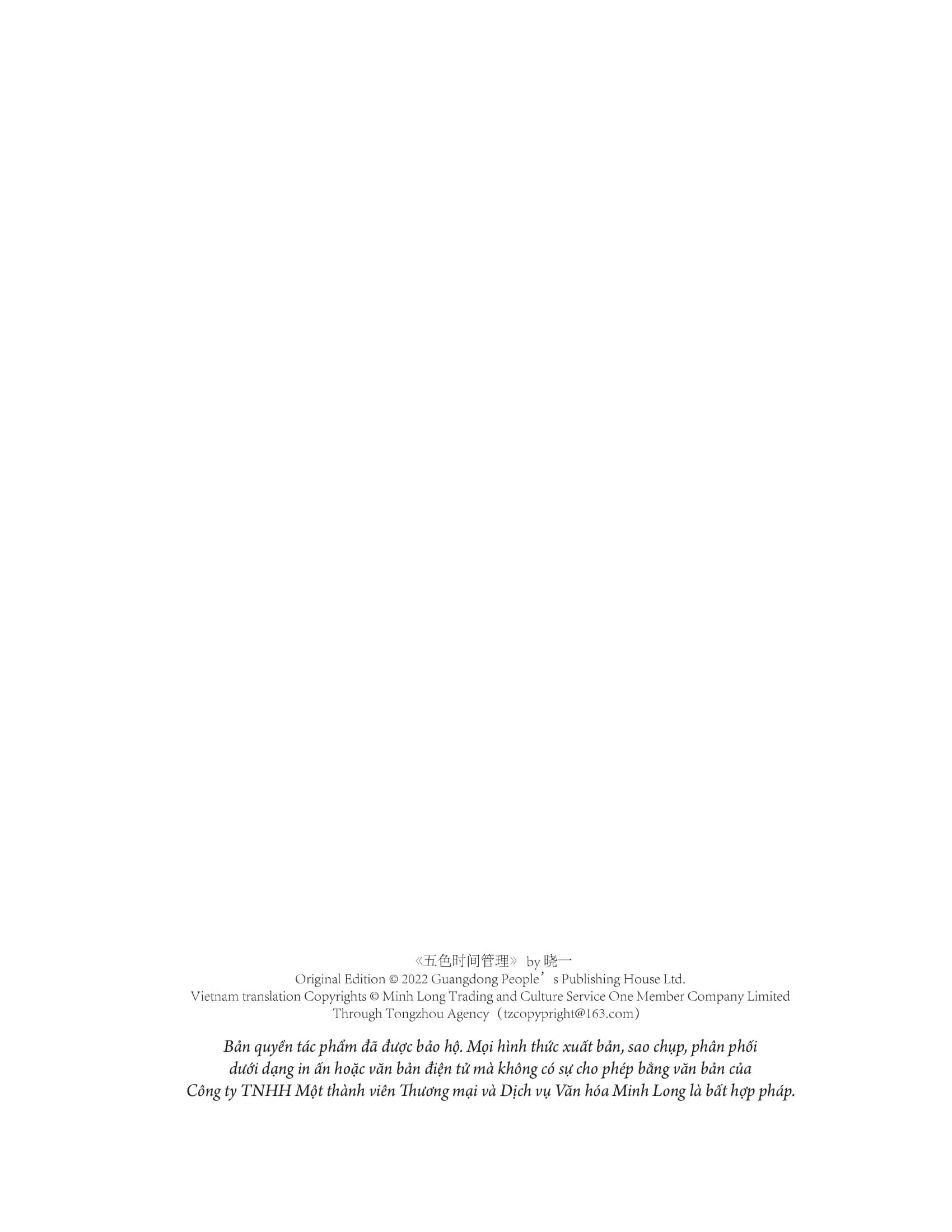 - Cấp độ thứ năm: Hình thành những thói quen nhỏ, khiến việc duy trì trở nên dễ dàng hơn. Cuốn sách này đưa ra 3 mẩu chuyện ngắn về phương pháp quản lí thời gian năm màu, 13 thực chiến quản lí thời gian năm màu, 14 cẩm nang phương pháp quản lí thời gian năm màu và 26 sơ đồ tư duy phương pháp quản lí thời gian năm màu. Trong phần Phụ lục có 11 lý thuyết quản lí thời gian thường thấy, 5 ứng dụng thường dùng để quản lí thời gian, danh mục sách tham khảo về quản lí thời gian và năm màu trong cuộc sống. Áp dụng phương pháp này vào thực tế, bạn sẽ sống một cuộc đời đầy màu sắc, cân bằng và tự do hơn!