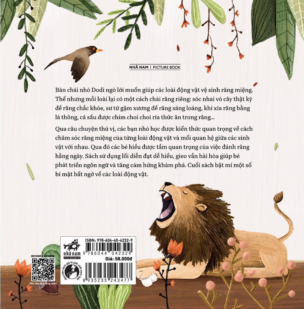 Bàn chải nhỏ Dodi ngỏ lời muốn giúp các loài động vật vệ sinh răng miệng. Thế nhưng mỗi loài lại có một cách chải răng riêng: sóc nhai vỏ cây thật kỹ để răng chắc khỏe, sư tử gặm xương để răng sáng loáng, khỉ xỉa răng bằng lá thông, cá sấu được chim choi choi rỉa thức ăn trong răng... Qua câu chuyện thú vị, các bạn nhỏ học được kiến thức quan trọng về cách chăm sóc răng miệng của từng loài động vật và mối quan hệ giữa các sinh vật với nhau. Qua đó các bé hiểu được tầm quan trọng của việc đánh răng hằng ngày. Sách sử dụng lối diễn đạt dễ hiểu, gieo vần hài hòa giúp bé phát triển ngôn ngữ và tăng cảm hứng khám phá. Cuối sách bật mí một số bí mật bất ngờ về các loài động vật.