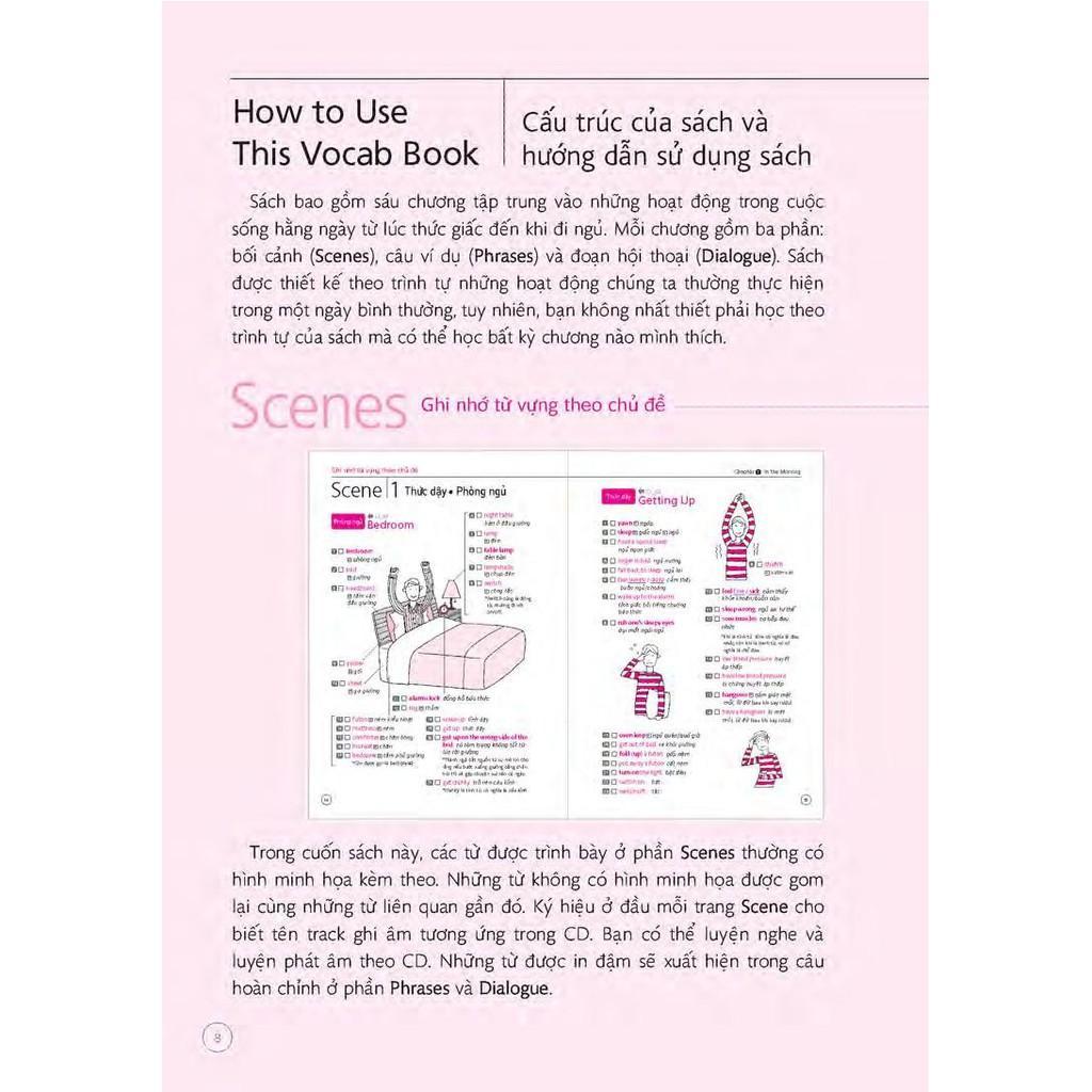 Sách bao gồm sáu chương, mỗi chương có ba bối cảnh (Scene) và được chia thành nhiều chủ đề cụ thể. Bạn không nhất thiết phải học từ chương một mà có thể học bất kỳ chương nào mình thấy cần thiết hoặc thú vị. Từ vựng thường có hình minh họa đi kèm để bạn dễ liên tưởng khi học. Sau khi học từ vựng, bạn hãy học cách dùng từ trong câu và trong đoạn hội thoại (Dialogue). Nếu thích câu nào, bạn có thể ghi vào sổ tay.