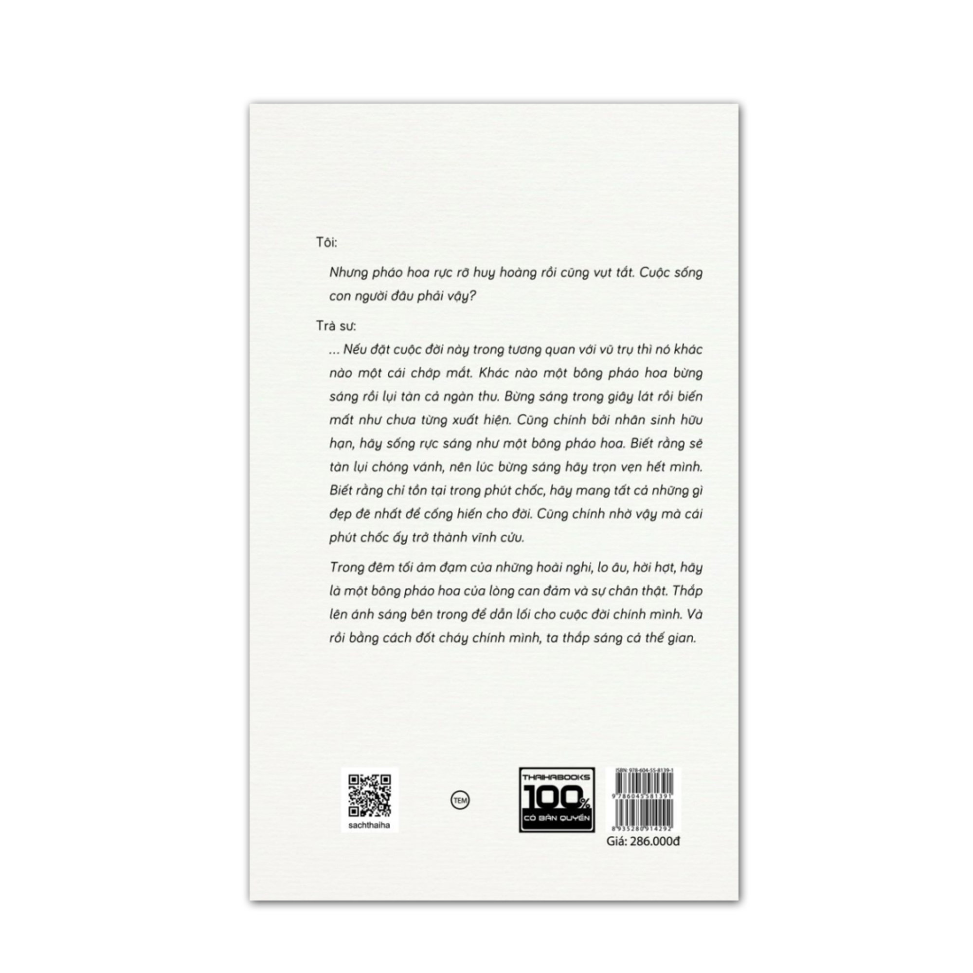 Những triết lý về cách sống giản dị mà sâu sắc ấy khiến chúng ta hiểu được sứ mệnh của mình giữa thế giới rộng lớn: Là một bông pháo hoa rực rỡ và hiến dâng những gì đẹp đẽ nhất cho cuộc đời. Dù chỉ sáng bừng trong khoảnh khắc, nhưng ta đã sống hết mình và nhờ đó cũng thắp sáng biết bao tâm hồn khác. Chính vì cách sống nhiệt thành và cho đi vô điều kiện ấy, chúng ta chạm gần hơn tới những vì sao.