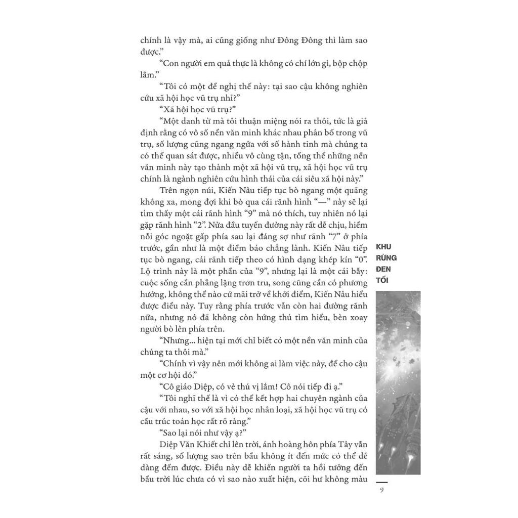 Phần thứ hai tam bộ khúc của Lưu Từ Hân, Khu rừng đen tối là một pho chiến quốc sử kỳ vĩ và kịch tính. Đó còn là một bức tranh gai người về tương lai, khi để sống sót giữa khu rừng đen tối ấy, không chỉ Trái đất đã thay đổi hoàn toàn diện mạo, mà con người cũng không còn giống như con người.