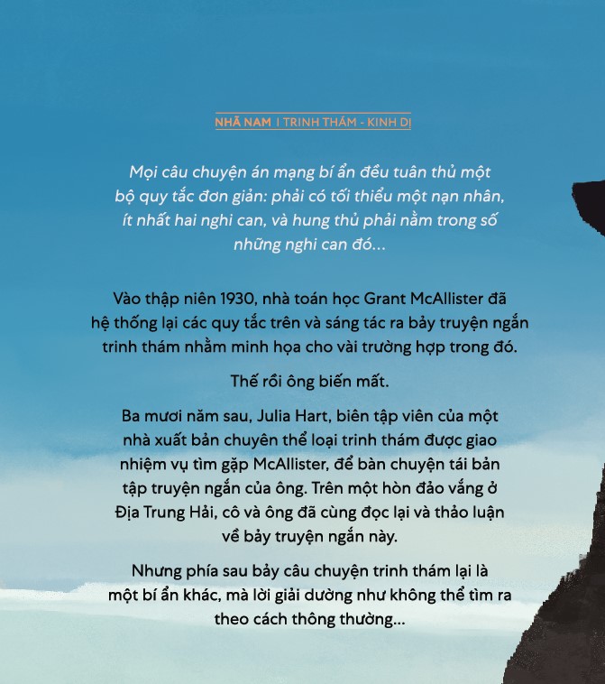 Ba mươi năm sau, Julia Hart, biên tập viên của một nhà xuất bản chuyên thể loại trinh thám được giao nhiệm vụ tìm gặp McAllister, để bàn chuyện tái bản tập truyện ngắn của ông. Trên một hòn đảo vắng ở Địa Trung Hải, cô và ông đã cùng đọc lại và thảo luận về bảy truyện ngắn này.