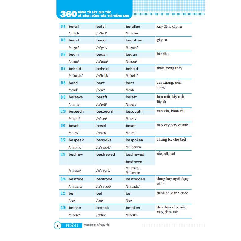 Cùng tham khảo cuốn sách để nắm vững 360 động từ bất quy tắc trong tiếng Anh nhé.