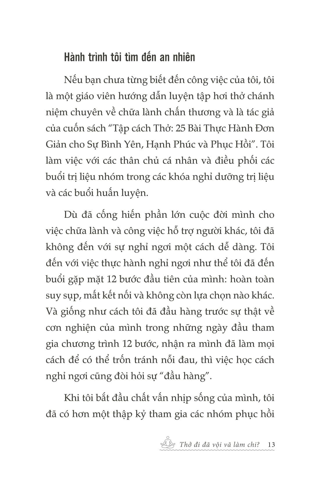 Thở Đi Đã - Vội Vã Làm Chi “Thở Đi Đã, Vội Vã Làm Chi” là cuốn sách chữa lành dành cho những ai đang bị cuốn vào vòng xoáy của nhịp sống hiện đại. Với lời văn nhẹ nhàng, tinh tế và sâu sắc, cuốn sách nhắc nhở chúng ta về một điều tưởng chừng rất đơn giản nhưng lại dễ bị lãng quên: hít một hơi thở chậm, và sống thật sự với hiện tại. Không giáo điều, không hô hào, sách như một người bạn thủ thỉ bên tai, khơi gợi cảm giác bình yên từ những điều nhỏ bé quanh m.ình. Nội dung chính của cuốn sách Cuốn sách gồm nhiều đoạn tản văn ngắn, mỗi chương là một lời nhắc nhở dịu dàng để ta quay về với chính m.ình. Nội dung tập trung vào các chủ đề: