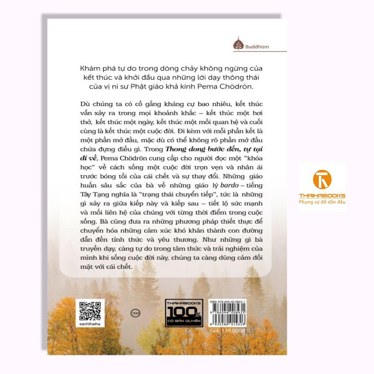 Dù chúng ta có cố gắng kháng cự bao nhiêu, kết thúc vẫn xảy ra trong mọi khoảnh khắc – kết thúc một hơi thở, kết thúc một ngày, kết thúc một mối quan hệ và cuối cùng là kết thúc một cuộc đời. Đi kèm với mỗi phần kết là một phần mở đầu, mặc dù có thể không rõ phần mở đầu chứa đựng điều gì. Trong Thong dong bước đến, tự tại đi về, Pema Chödrön cung cấp cho người đọc một “khóa học” về cách sống một cuộc đời trọn vẹn và nhân ái trước bóng tối của cái chết và sự thay đổi. Những giáo huấn sâu sắc của bà về những giáo lý bardo – tiếng Tây Tạng nghĩa là “trạng thái chuyển tiếp”, tức là những gì xảy ra giữa kiếp này và kiếp sau tiết lộ sức mạnh và mối liên hệ của chúng với từng thời điểm trong cuộc sống. Bà cũng đưa ra những phương pháp thiết thực để chuyển hóa những cảm xúc khó khăn thành con đường dẫn đến tỉnh thức và yêu thương. Như những gì bà truyền dạy, càng tự do trong tâm thức và trải nghiệm của mình khi sống cuộc đời này, chúng ta càng dũng cảm đối mặt với cái chết.