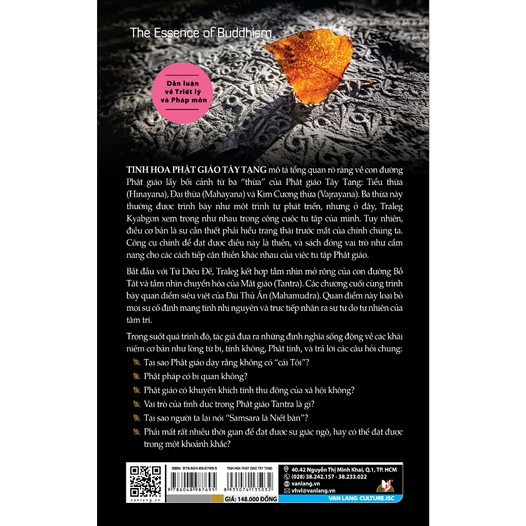 TINH HOA PHẬT GIÁO TÂY TẠNG mô tả tổng quan rõ ràng về con đường Phật giáo lấy bối cảnh từ ba “thừa” của Phật giáo Tây Tạng: Tiểu thừa (Hinayana), Đại thừa (Mahayana) và Kim Cương thừa (Vajrayana). Ba thừa này thường được trình bày như một trình tự phát triển, nhưng ở đây, Traleg Kyabgon xem trọng như nhau trong công cuộc tu tập của mình. Tuy nhiên, điều cơ bản là sự cần thiết phải hiểu trạng thái trước mắt của chính chúng ta. Công cụ chính để đạt được điều này là thiền, và sách đóng vai trò như cẩm nang cho các cách tiếp cận thiền khác nhau của việc tu tập Phật giáo.