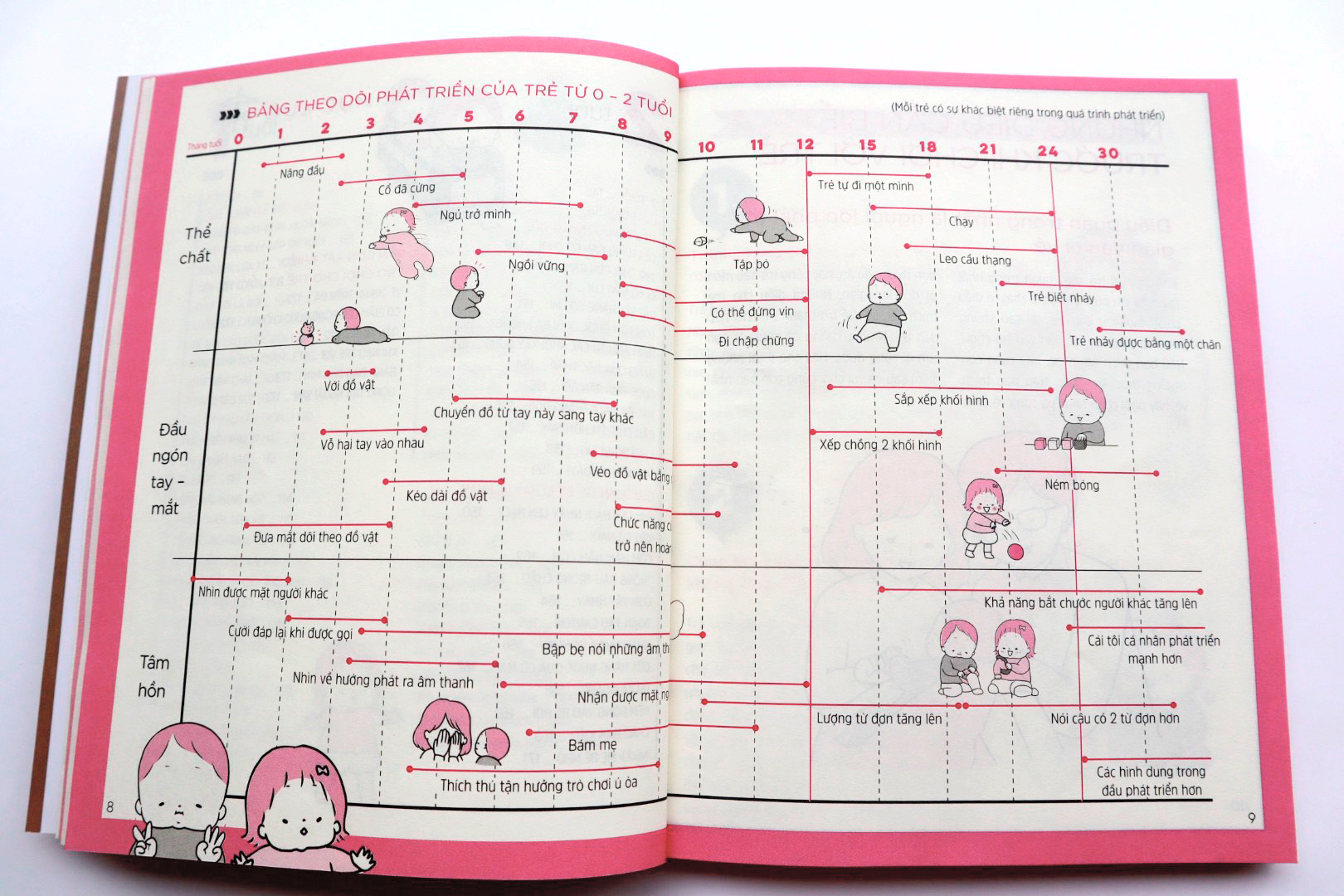 Cuốn sách được minh họa chủ yếu bằng hình ảnh, nội dung đơn giản, dễ đọc, dễ hiểu được chia theo các giai đoạn tăng trưởng của trẻ từ 0-2 tuổi. Bao gồm những điểm chính về sự phát triển của trẻ, kèm theo bảng tham khảo để cha mẹ không bỏ lỡ giai đoạn phát triển quan trọng của con.