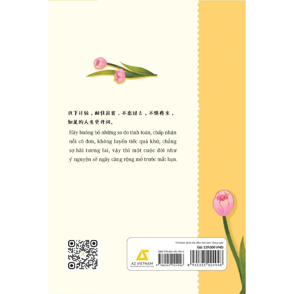 Hãy để “Trở thành phiên bản điềm tĩnh hơn” Bản song ngữ Trung – Việt được đồng hành cùng bạn trong hành trình tìm kiếm bình yên và hoàn thiện chính mình. Nhẹ nhàng và tinh tế, cuốn sách sẽ luôn nhắc nhở bạn rằng: Dù cuộc sống có vội vã đến đâu, chỉ cần tâm tĩnh – lòng an, thì mọi điều tốt đẹp tự khắc sẽ tìm đến.