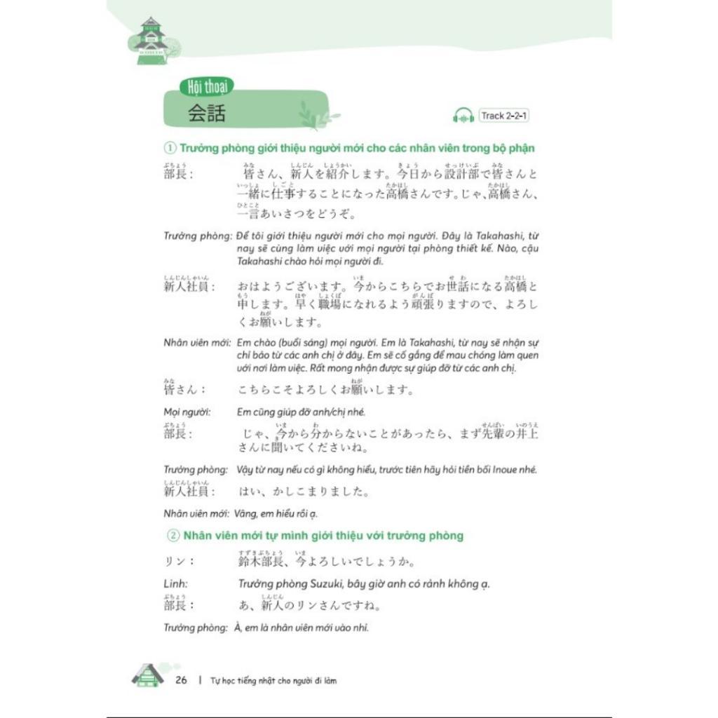 Tự học tiếng Nhật cho người đi làm là cuốn cẩm nang thiết yếu dành cho người lao động bởi sách cung cấp các mẫu câu giao tiếp và hội thoại theo các chủ đề gần gũi với đời sống hàng ngày bao gồm chữ Hán, Furigana (cách đọc chữ Hán) và dịch nghĩa. Bên cạnh đó, sách còn giải thích các kiến thức ngữ pháp hoàn toàn bằng tiếng Việt và cung cấp hệ thống từ vựng theo các chuyên ngành giúp người học có thể vận dụng kiến thức linh hoạt vào công việc và cuộc sống.