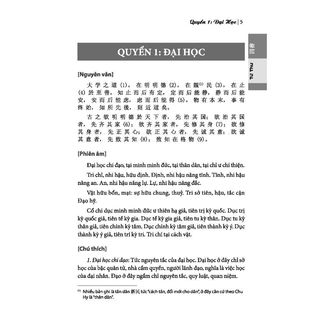 Bộ sách Tứ Thư là tổng hợp của bốn quyển sách, bao gồm: Đại Học, Trung Dung, Luận Ngữ, Mạnh Tử, được trình bày chi tiết qua những phần căn bản sau:
