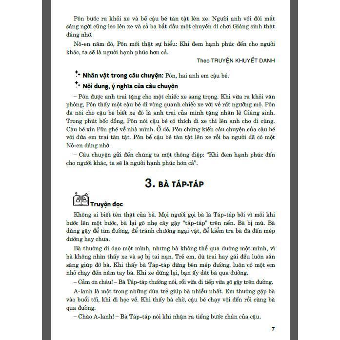 Những truyện được sưu tầm, tuyển chọn đều chứa đựng bài học giáo dục phù hợp với lứa tuổi của các em. Đó là bài học về tình yêu quê hương đất nước, tình làng nghĩa xóm, tình cảm gia đình, tình thầy trò, bè bạn,... Nhân vật trong truyện có thể là người hoặc cây cối, con vật, các hiện tượng thiên nhiên được nhân hoá. Qua hệ thống nhân vật và mối quan hệ giữa các nhân vật, bài học giáo dục sâu sắc từ câu chuyện không đến với các em một cách khô khan, gượng ép, cứng nhắc mà dần thấm vào tâm hồn trẻ thơ của các em.