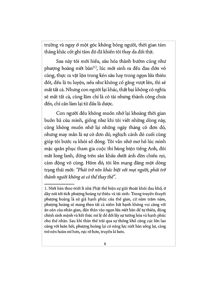 Đúng vậy, liệu có nhất định phải hòa vào số đông hay không? Có nhất định phải giống những người khác hay không? Cho đến hôm nay, tôi vẫn phải cảm ơn bản thân đã kiên trì luyện tập nói tiếng Anh trong giảng đường trống, trên thao trường và ngay ở một góc không bóng người, thời gian tám tháng khắc cốt ghi tâm đó đã khiến tôi thay da đổi thị