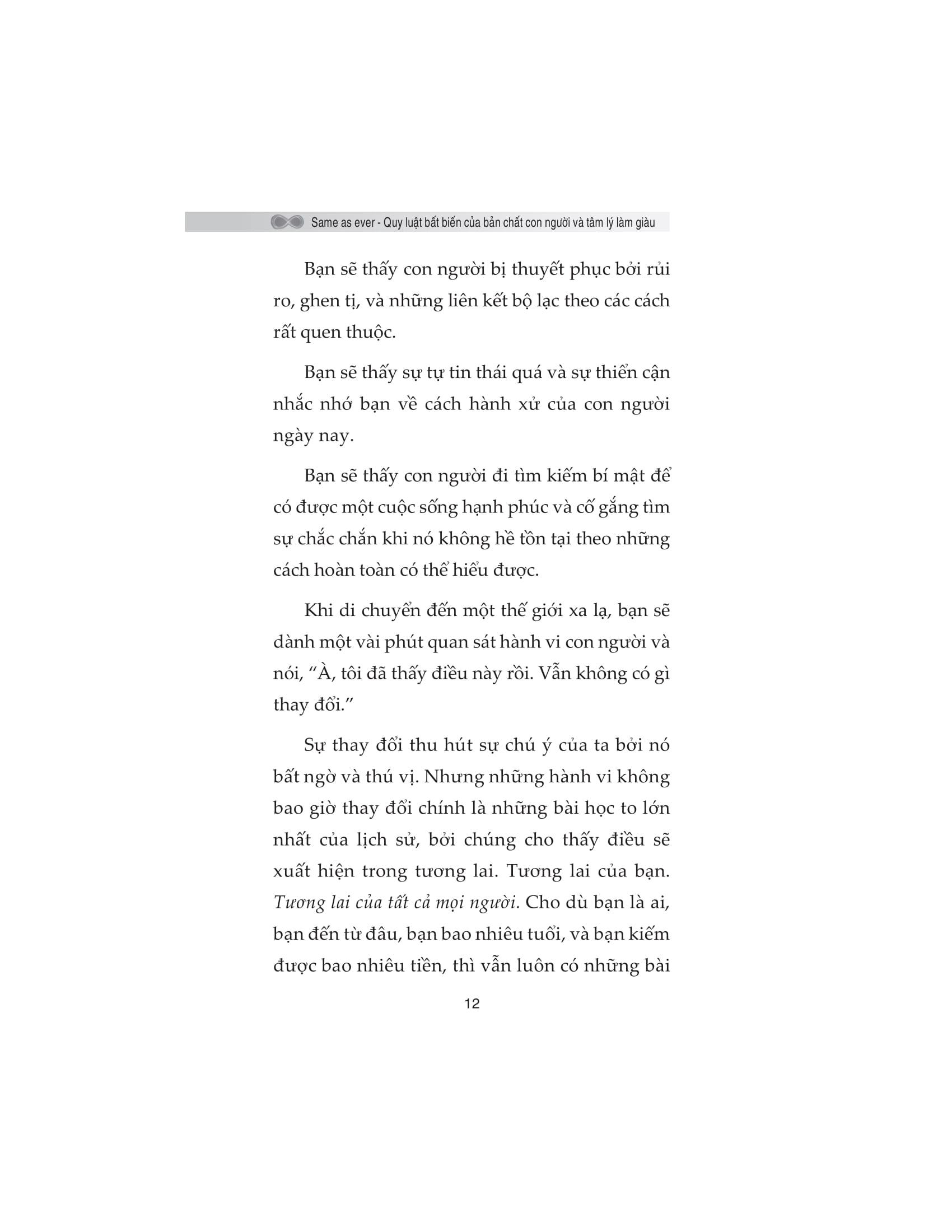 Trong cuốn sách “Same as ever: Quy luật bất biến về bản chất con người và tâm lý làm giàu” tác giả Morgan Housel đưa ra những bài học về kiểm soát rủi ro, nắm bắt cơ hội và sống cuộc sống tốt nhất. Thông qua một chuỗi các câu chuyện hấp dẫn và những ví dụ dễ hiểu, Morgan Housel chỉ ra cách chúng ta có thể sử dụng quy luật không bao giờ thay đổi để nhìn rõ hơn về bối cảnh không chắc chắn của tương lai, tập trung vào những gì là sự thật vĩnh viễn.