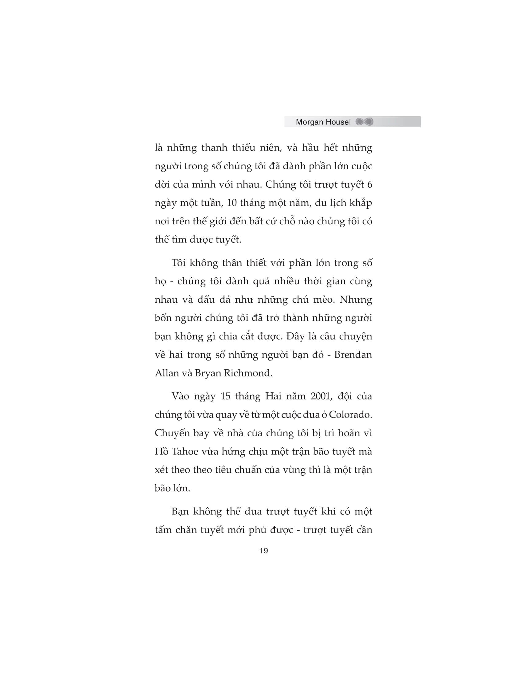 Morgan Housel là tác giả cuốn sách bán chạy Tâm lý học về tiền, ông nổi tiếng về lĩnh vực tài chính – đầu tư – kinh doanh. Ông là đối tác của The Collaborate Fund và cây bút chủ lực của nhiều chuyên trang nổi tiếng, đạt giải thưởng Kinh doanh xuất sắc nhất của Hiệp hội Nhà văn và Biên tập Kinh doanh Hoa Kỳ.