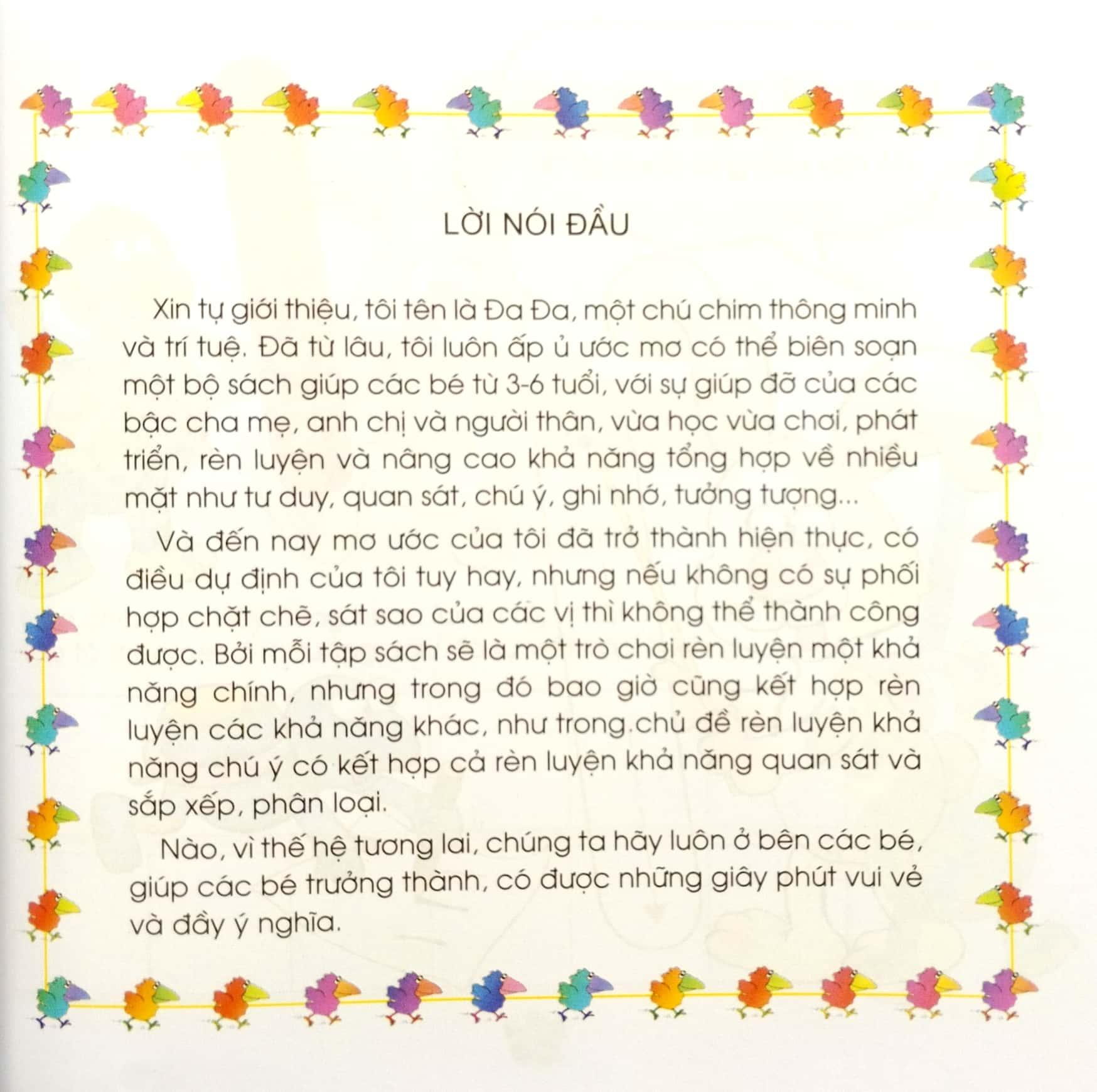 Và đến nay mơ ước của tôi đã thành hiện thực, có điều dự định của tôi tuy hay nhưng nếu không có sự phối hợp chặt chẽ, sát sao của các vị thì không thể thành công được. Bởi mỗi tập sách sẽ là một trò chơi rèn luyện một khả năng chính, nhưng trong đó bao giờ cũng kết hợp rèn luyện các khả năng khác, như trong chủ đề rèn luyện khả năng chú ý có kết hợp cả rèn luyện khả năng quan sát và sắp xếp, phân loại. Nào, vì thế hệ tương lai, chúng ta hãy luôn ở bên các bé, giúp các bé trưởng thành, có được những giây phút vui vẻ và đầy ý nghĩa.