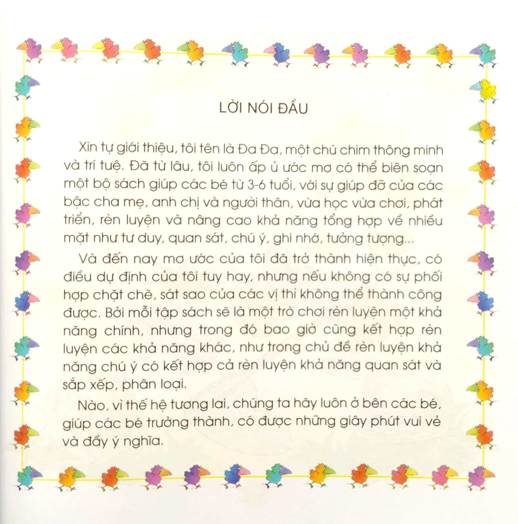 Và đến nay mơ ước của tôi đã thành hiện thực, có điều dự định của tôi tuy hay nhưng nếu không có sự phối hợp chặt chẽ, sát sao của các vị thì không thể thành công được. Bởi mỗi tập sách sẽ là một trò chơi rèn luyện một khả năng chính, nhưng trong đó bao giờ cũng kết hợp rèn luyện các khả năng khác, như trong chủ đề rèn luyện khả năng chú ý có kết hợp cả rèn luyện khả năng quan sát và sắp xếp, phân loại. Nào, vì thế hệ tương lai, chúng ta hãy luôn ở bên các bé, giúp các bé trưởng thành, có được những giây phút vui vẻ và đầy ý nghĩa.