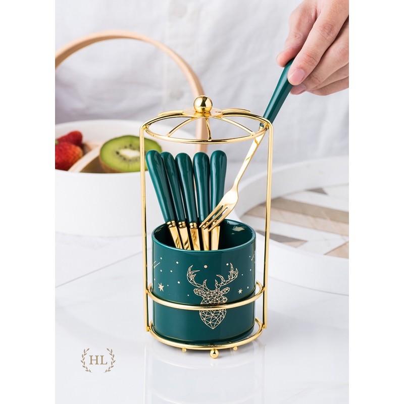Gồm ống đựng muỗng nĩa bằng sứ có khung bao bên ngoài, 6 nĩa inox 304 có tay cầm bằng sứ màu xanh ngọc lưu ly cực kỳ sang trọng.