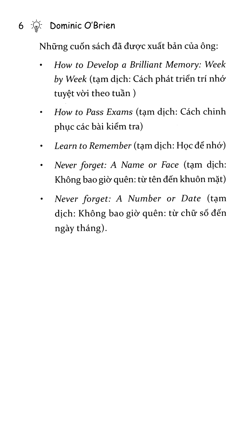 “Trong cuốn sách này, tôi muốn chỉ cho bạn cách rèn luyện trí nhớ. Mục đích không chỉ để thành thạo những bài tập não bộ mà bạn chưa bao giờ nghĩ là mình có thể làm được, mà còn là đòn bẩy giúp tăng sự tự tin của bạn, cũng giống như tôi vậy. Khi bạn đã có ý niệm về tiềm năng bên trong trí nhớ của mình, thì bạn cũng sẽ sớm nhận ra tiềm năng đó còn có thể áp dụng cho những mặt khác của não bộ, từ khả năng tập trung và phản xạ nhanh nhạy (hay còn gọi là “trí thông minh mềm”) cho đến sự tự tin khi kể chuyện, khi diễn thuyết và thậm chí là cả khả năng ứng biến.