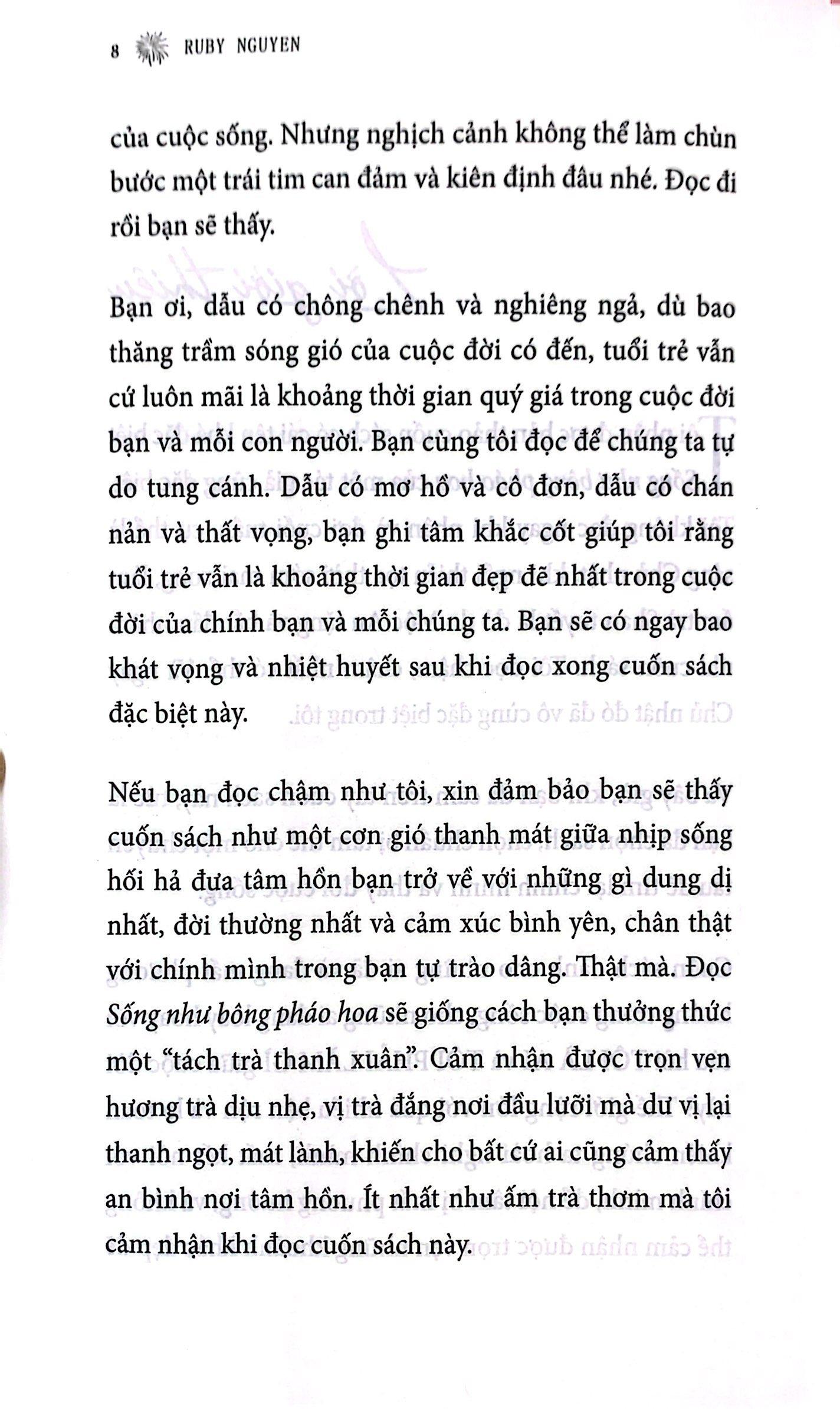 Cuốn sách “Sống như bông p.háo hoa” là một cuộc hành trình khám phá điều quý giá nhất cuộc đời. Trong phòng trà giản dị, yên bình giữa núi rừng Đà Lạt, chúng ta được xem thước phim tua chậm về cuộc trò chuyện giữa tác giả và Trà sư. Độc giả như thấy chính m.ình qua những trải lòng và suy tư của tác giả Ruby Nguyen, tuy có lúc chông chênh và mất phương hướng nhưng mỗi người là một mảnh ghép không thể thiếu trong bức tranh cuộc đời rộng lớn. Những lời khuyên đầy tính triết lý, nhân văn của Trà sư khiến chúng ta hiểu ra một điều: Chỉ có tình yêu thương và tấm lòng rộng mở mới khiến chúng ta tìm được bình yên nơi tâm hồn và làm cuộc đời này trở nên ý nghĩa, đáng sống.