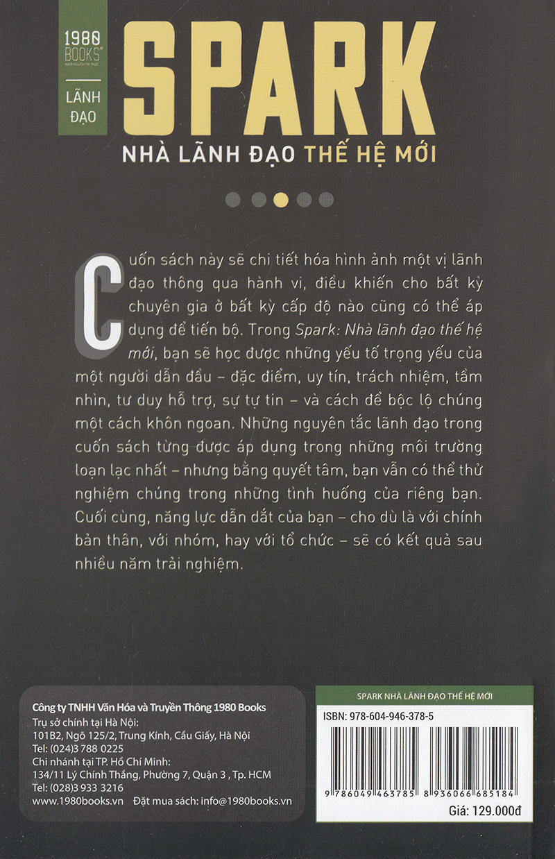Nhiều chia sẻ của các tác giả - những người đã trải qua những năm tháng lãnh đạo loạn lạc nhất sẽ được tiết lộ. SPARK: Nhà lãnh đạo thế hệ mới là tài liệu thamkhảo trung thực và đầy sức nặng. Tác giả danh tiếng Jim Kouzes khen ngợi: Tất cả các nhà lãnh đạo đều thấy được lợi ích khi đọc và áp dụng "Spark". Tôi khuyên bạn nên đọc nó ngay .