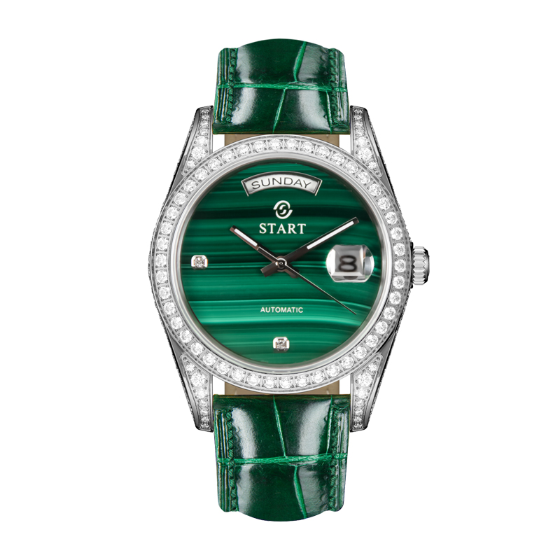 ★Thương hiệu:START★ Đặc điểm: Mặt số malachit tự nhiên, vỏ nạm kim cương, dạ quang,ngày,Tuần,kim giờ dạ quang Khả năng chống thấm nước: 50 mét không thấm nước Loại lõi đồng hồ: Lõi đồng hồ
